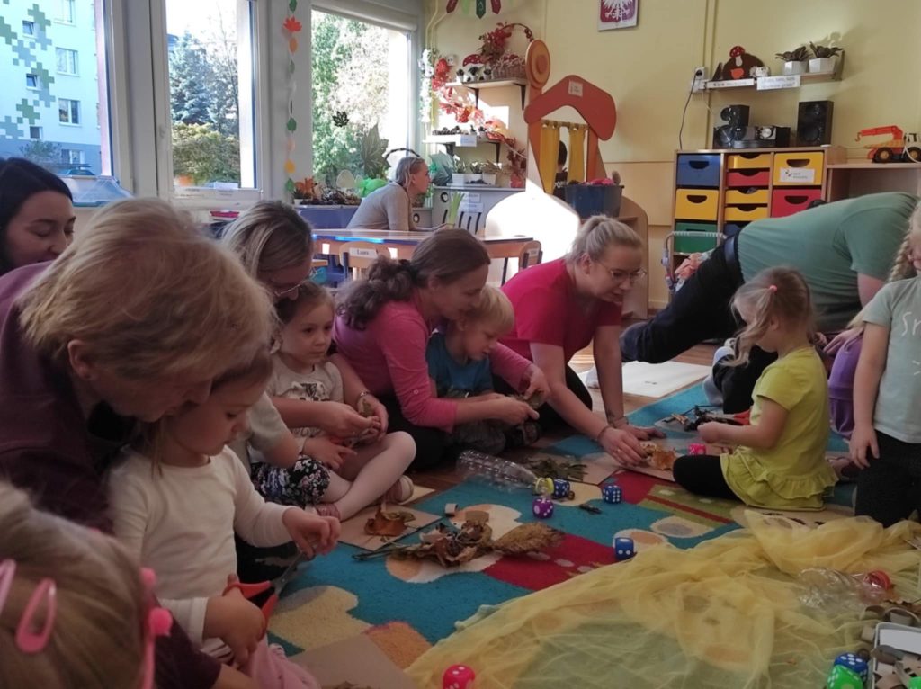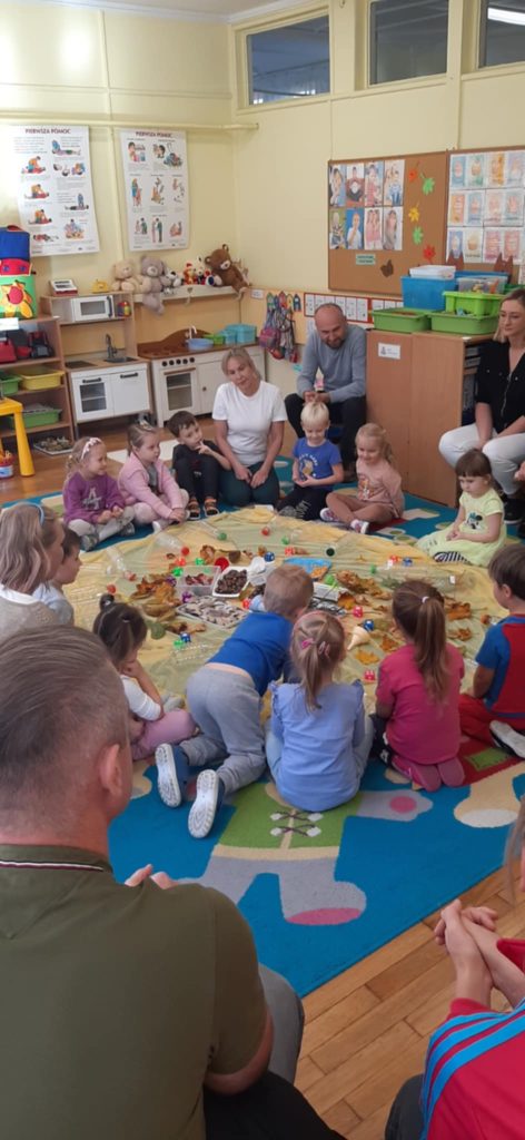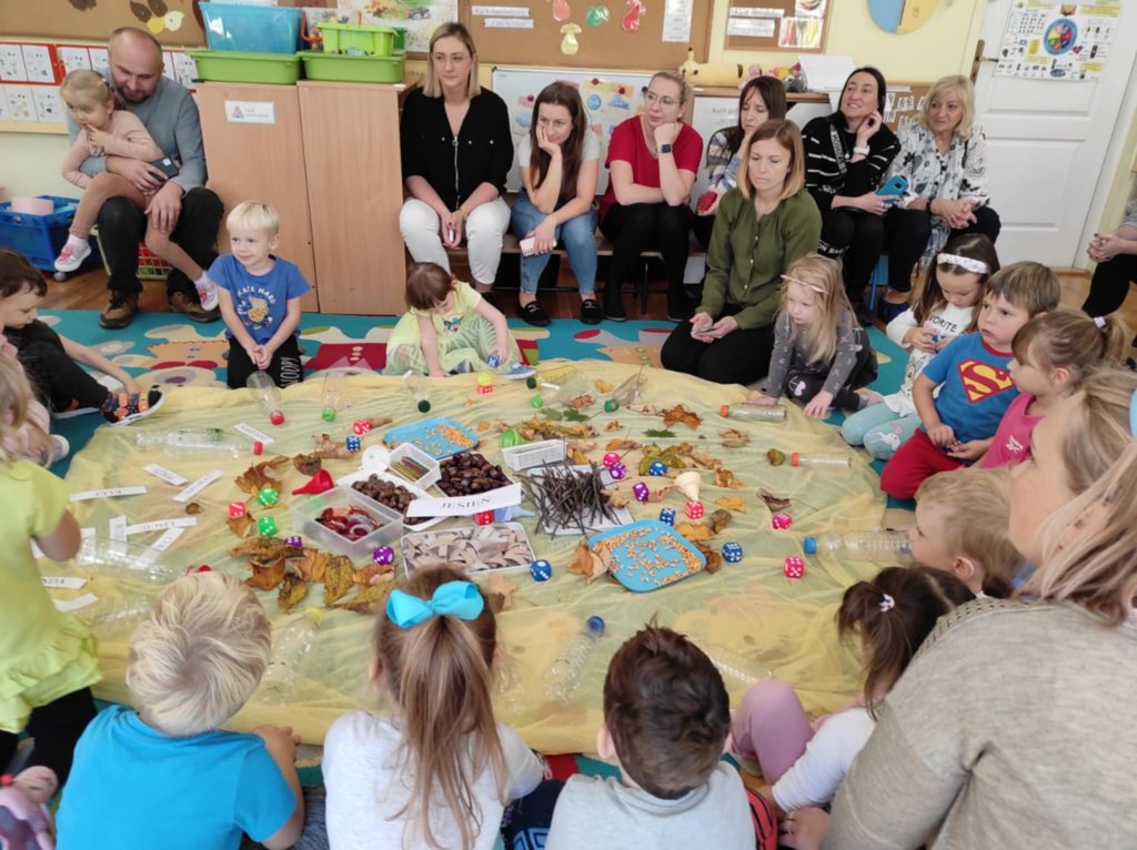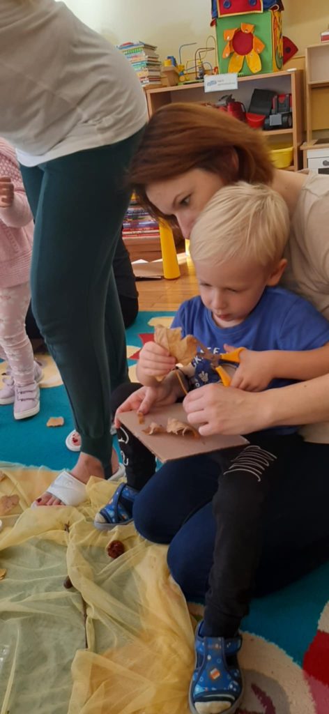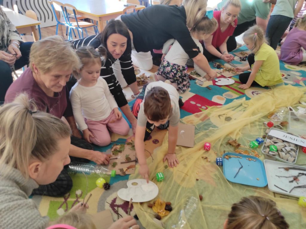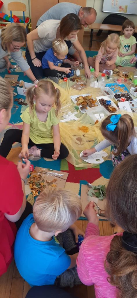 17.10.2024 r. przedszkolaki z grupy „Misie“ wzięły udział w zajęciach warsztatowych z udziałem swoich najbliższych, Rodziców i Babć. Podczas zajęć o tematyce „Sensoryczna Jesień“ „Misie“ dowiedziały się, że jesień symbolizuje żółty kolor, smak miodu, zapach lawendy, a żywiołem jest wiatr. Nasze 4-latki mogły poćwiczyć cięcie, tnąc liście, usprawniały małą motorykę „ubierając“ szyszki w sweterki, rozwijały zmysł dotyku, smaku, wzroku, słuchu, węchu. „Misie“ wspólnie z rodzicami ćwiczyły liczenie, segregowanie, kategoryzowanie. Na koniec wykonały piękne kolorowe jesienne drzewka i jesienne butelki sensoryczne. Wszystkie te działania służyły rozwojowi zmysłów, wspieraniu małej motoryki, umiejętności matematycznych, budowaniu więzi z bliskimi. Dziękujemy wszystkim Państwu za obecność i aktywny udział w zajęciach.