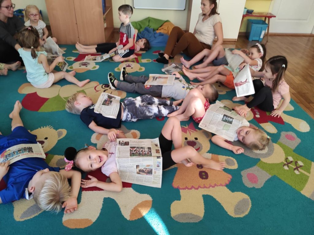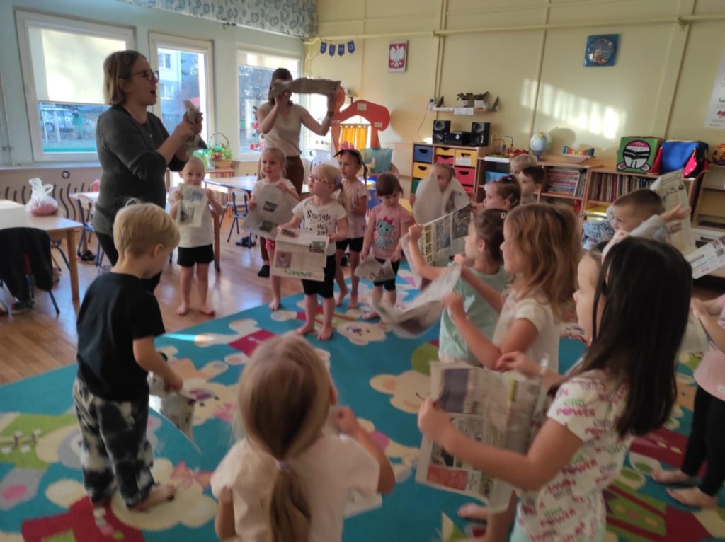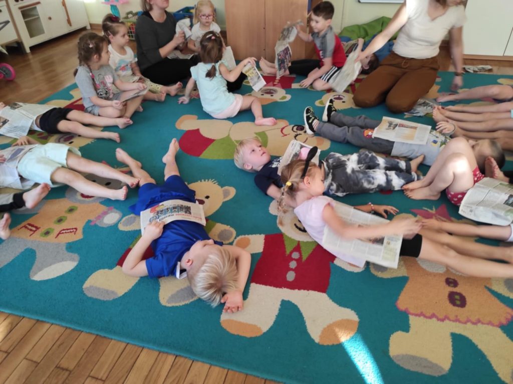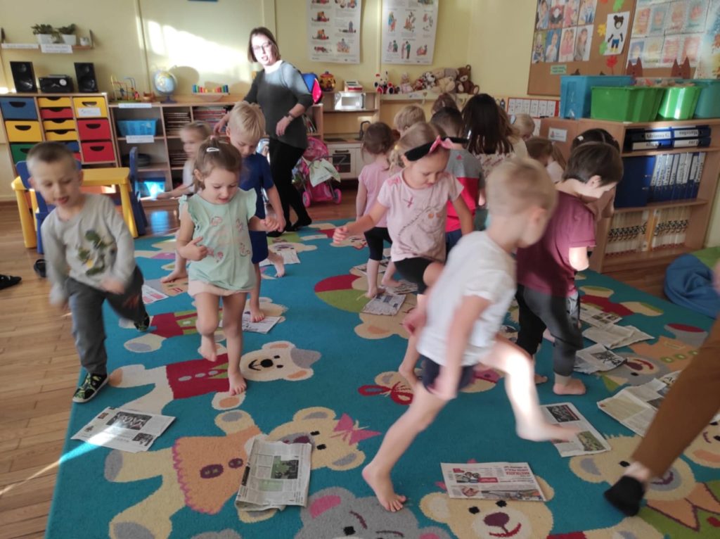 Podczas zajęć dzieci przeniosły się do „Deszczowej krainy“, którą mogły oczyma wyobraźni obejrzeć razem z jej królem. Ćwiczenia odbywały się przy akompaniamencie muzyki i z wykorzystaniem nietypowej pomocy, gazety. Różnorodność form ruchowych oraz sposób prowadzenia takich zajęć daje dzieciom możliwość twórczego działania, poznania własnego ciała, rozwija poczucie rytmu, doskonali koordynację ruchową, kształtuje orientację przestrzenną oraz wyobraźnię ruchową i własną inwencję w tym zakresie. Ponadto daje możliwość improwizowania i realizowania naturalnej potrzeby ruchu.