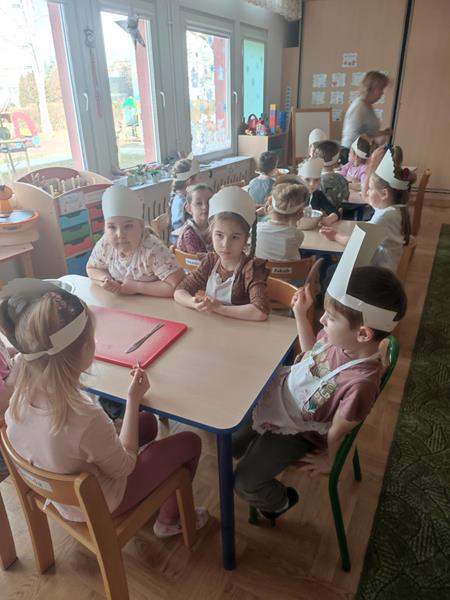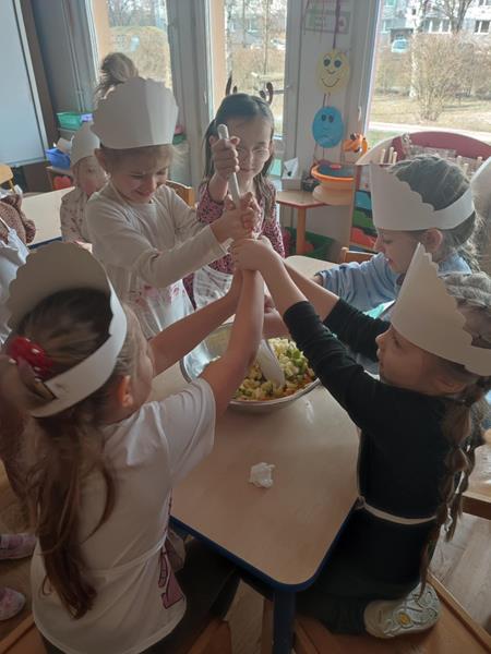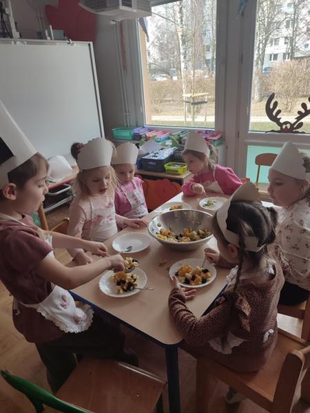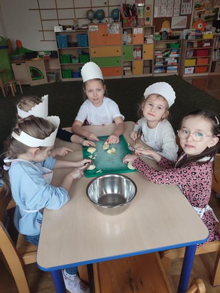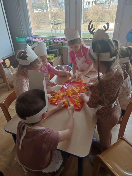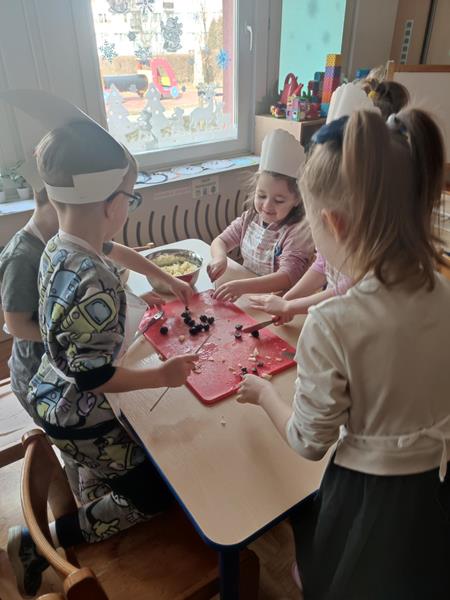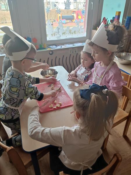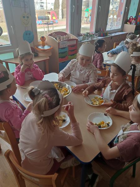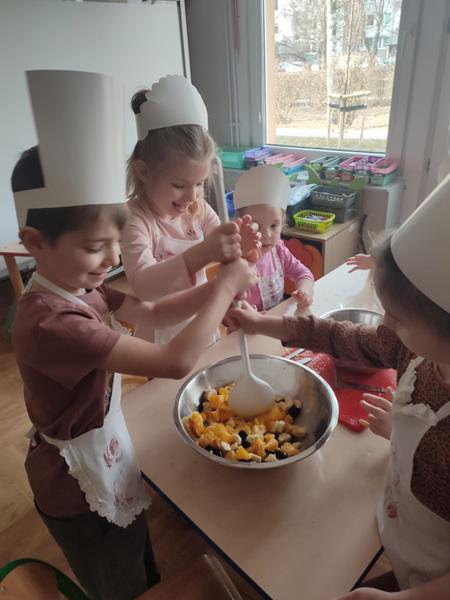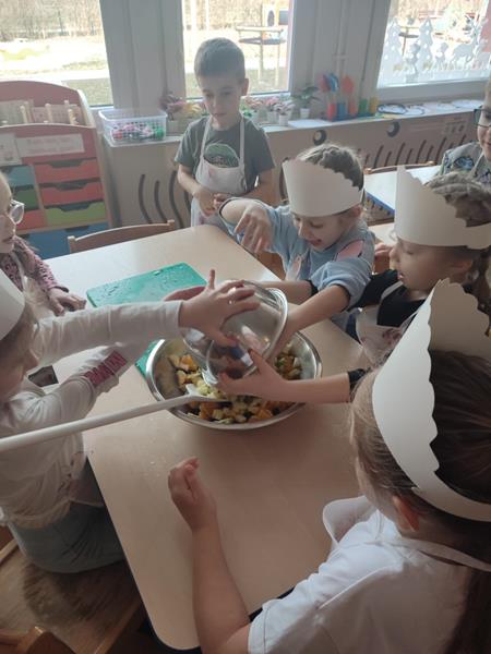 26.02.2025 r. dzieci z grupy „Zajączki” na zajęciach samodzielnie przygotowały sałatkę owocową, bawiły się w zgadywanie ,,Jakim owocem, warzywem jestem?” oraz zabawę ruchową ,,Sałatka owocowa”. Było smacznie, a przede wszystkim zdrowo. Zajęcia zostały przeprowadzone w ramach realizacji programu edukacyjnego „Moje dziecko idzie do szkoły”, którego celem jest kształtowanie prawidłowych nawyków prozdrowotnych u dzieci oraz zachęcanie do zdrowego stylu życia. Przed przystąpieniem do pracy dzieci dokładnie umyły ręce, pamiętając o zasadach higieny. Założyły fartuszki oraz papierowe czepki na głowę wcielając się w rolę kucharzy i kucharek. Przedszkolaki pokazały, że potrafią bezpiecznie posługiwać się nożem podczas krojenia owoców na małe kawałki. Dzieciom wyjątkowo smakowały owoce w takiej postaci, tym bardziej, że był to efekt ich wspólnego wkładu pracy. Przygotowanie sałatki dało dzieciom wiele satysfakcji jednocześnie uświadamiając, jak ważną rolę odgrywają witaminy we właściwym funkcjonowaniu organizmu.