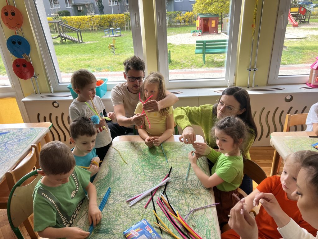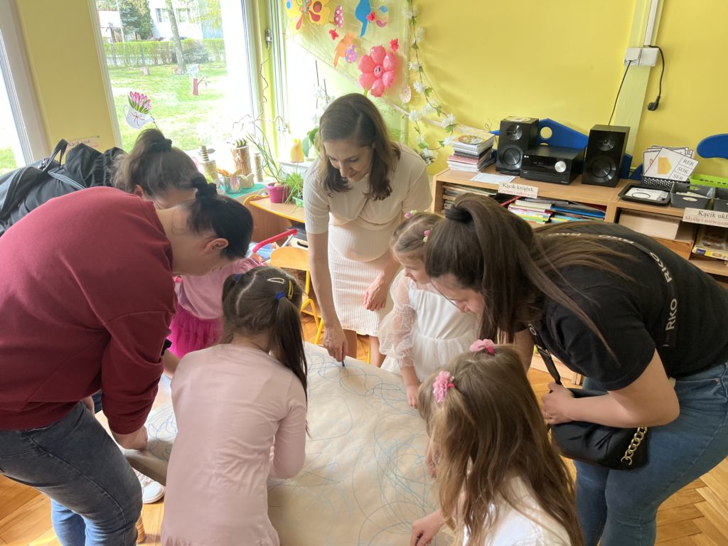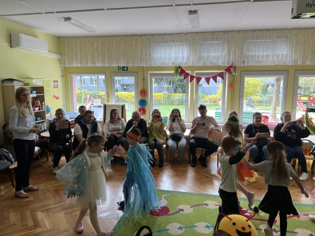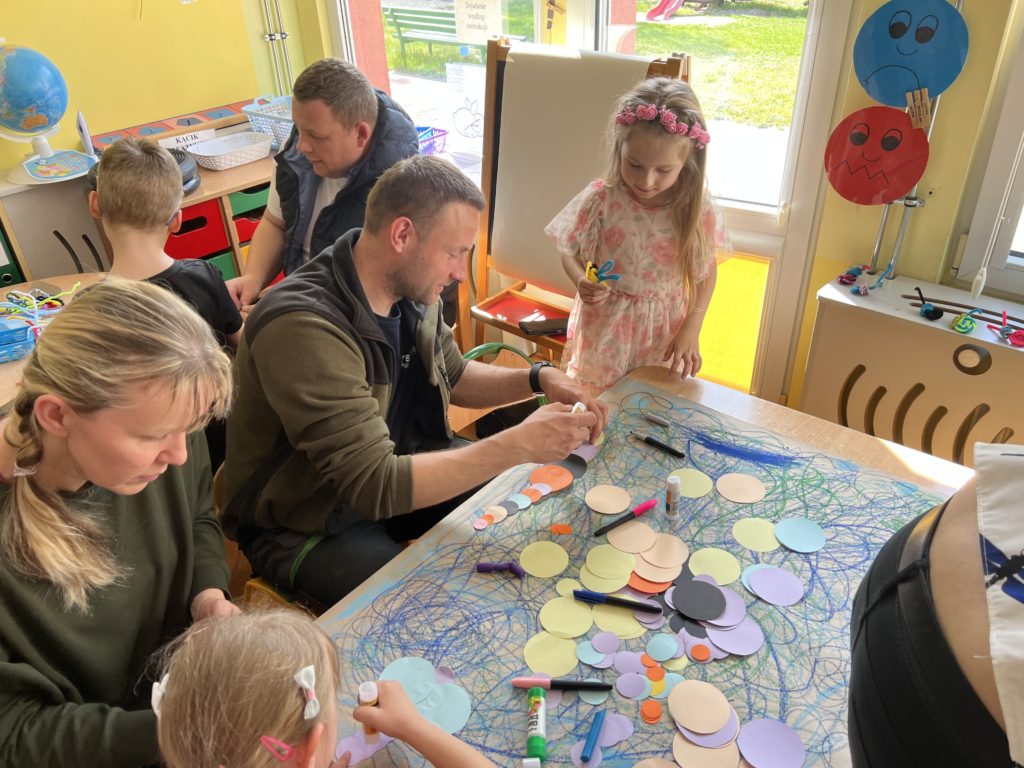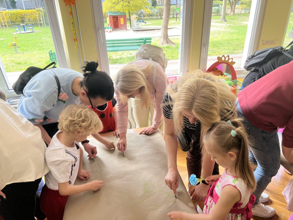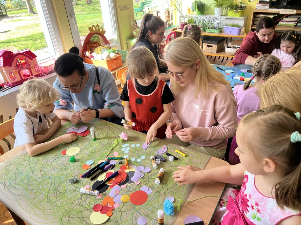 W kwietniu w grupie „Biedronki“ odbyły się warsztaty z Rodzicami. W tym dniu Rodzice mogli zobaczyć inscenizację wiosenną w wykonaniu swoich dzieci oraz razem z nimi wzięli udział w warsztatach pt. „Wiosenna łąką“ metoda Edukacji przez Ruch Doroty Dziamskiej. Wspólnie w rytm muzyki , wykonali wiosenną łąkę na dużych arkuszach papieru.