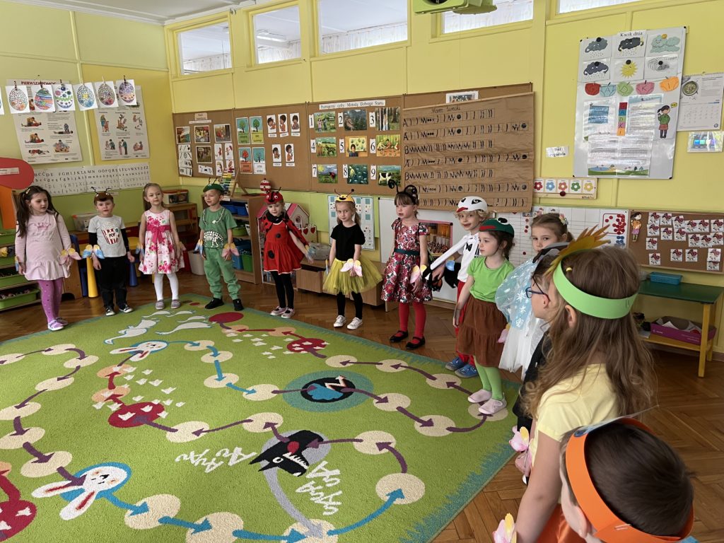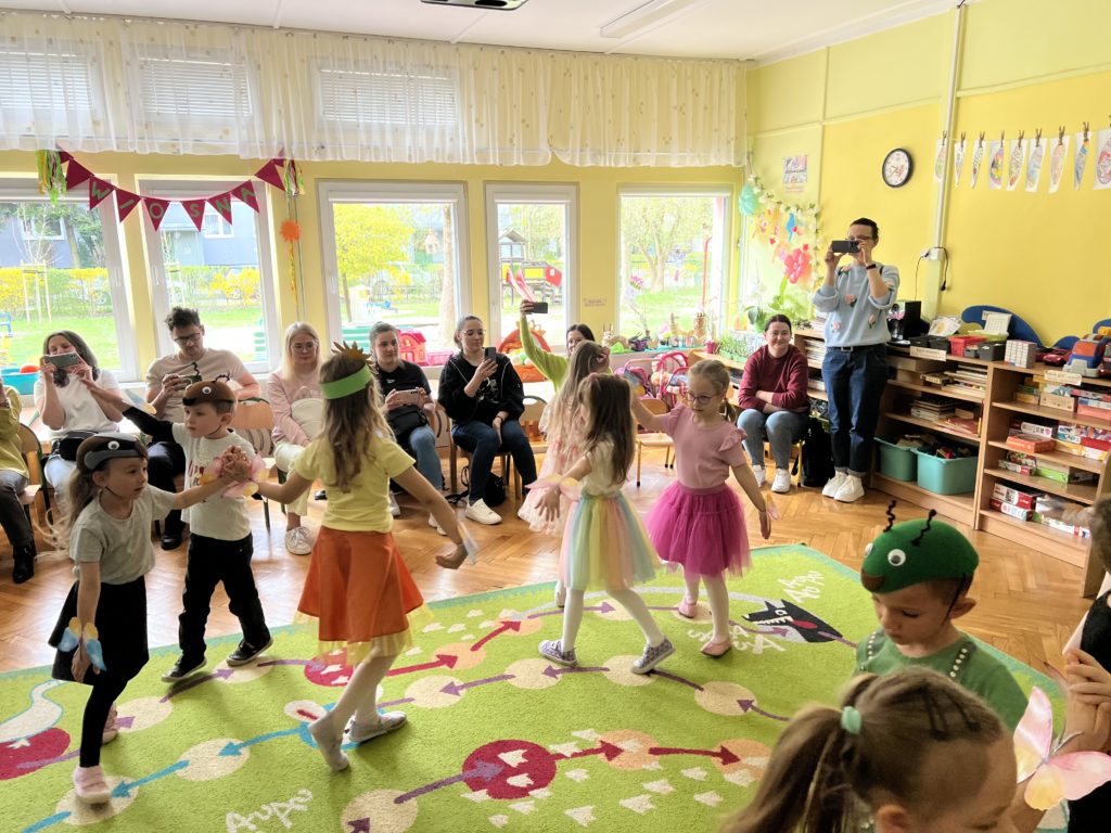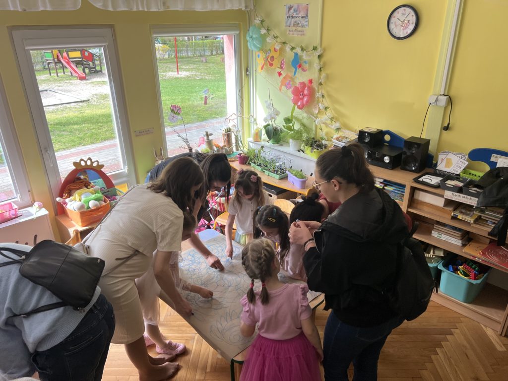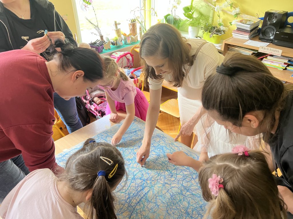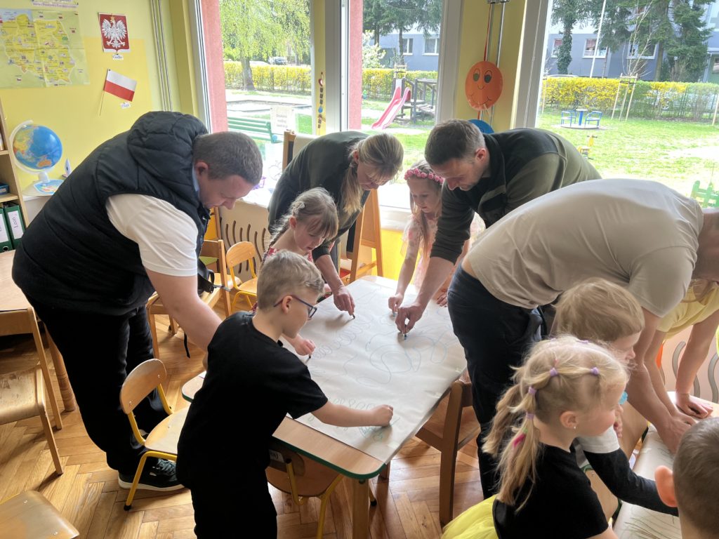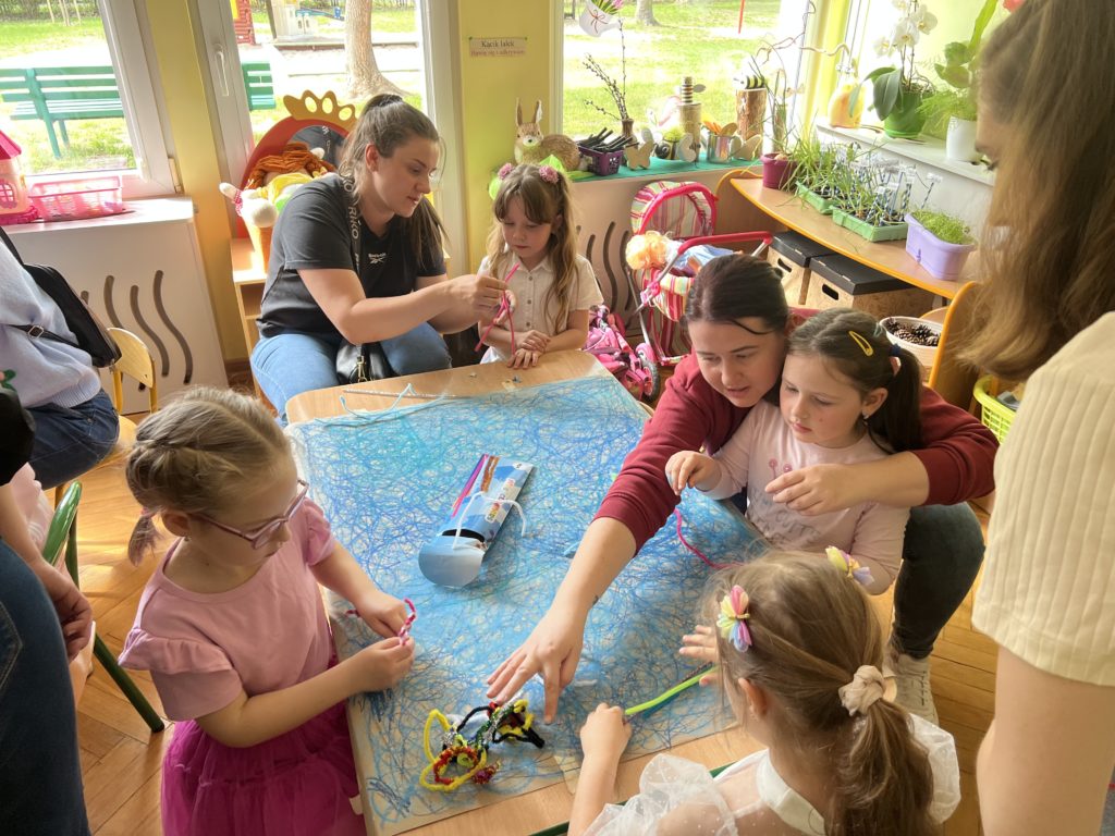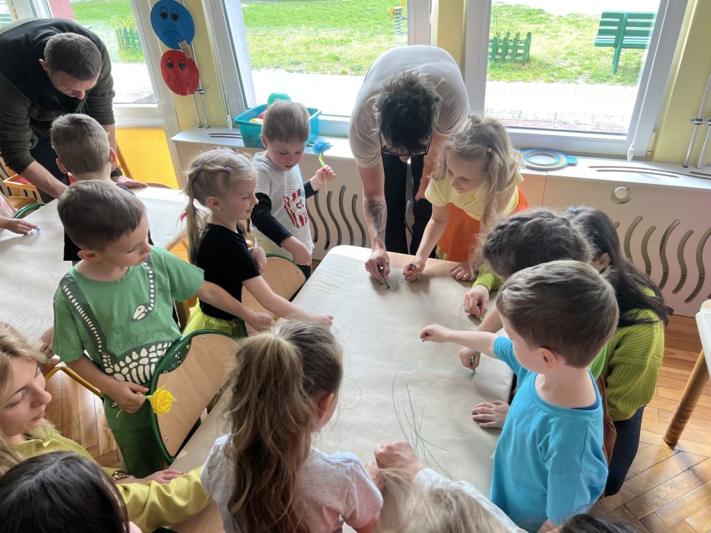 W kwietniu w grupie „Biedronki“ odbyły się warsztaty z Rodzicami. W tym dniu Rodzice mogli zobaczyć inscenizację wiosenną w wykonaniu swoich dzieci oraz razem z nimi wzięli udział w warsztatach pt. „Wiosenna łąką“ metoda Edukacji przez Ruch Doroty Dziamskiej. Wspólnie w rytm muzyki , wykonali wiosenną łąkę na dużych arkuszach papieru.