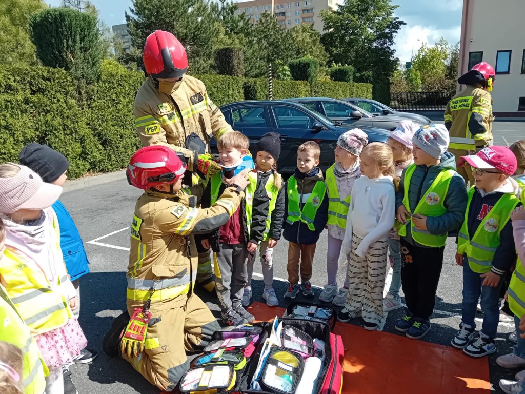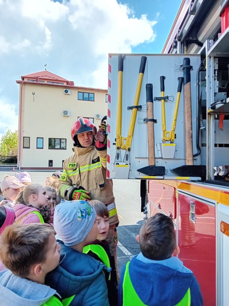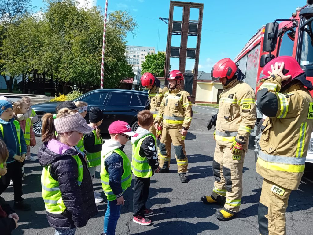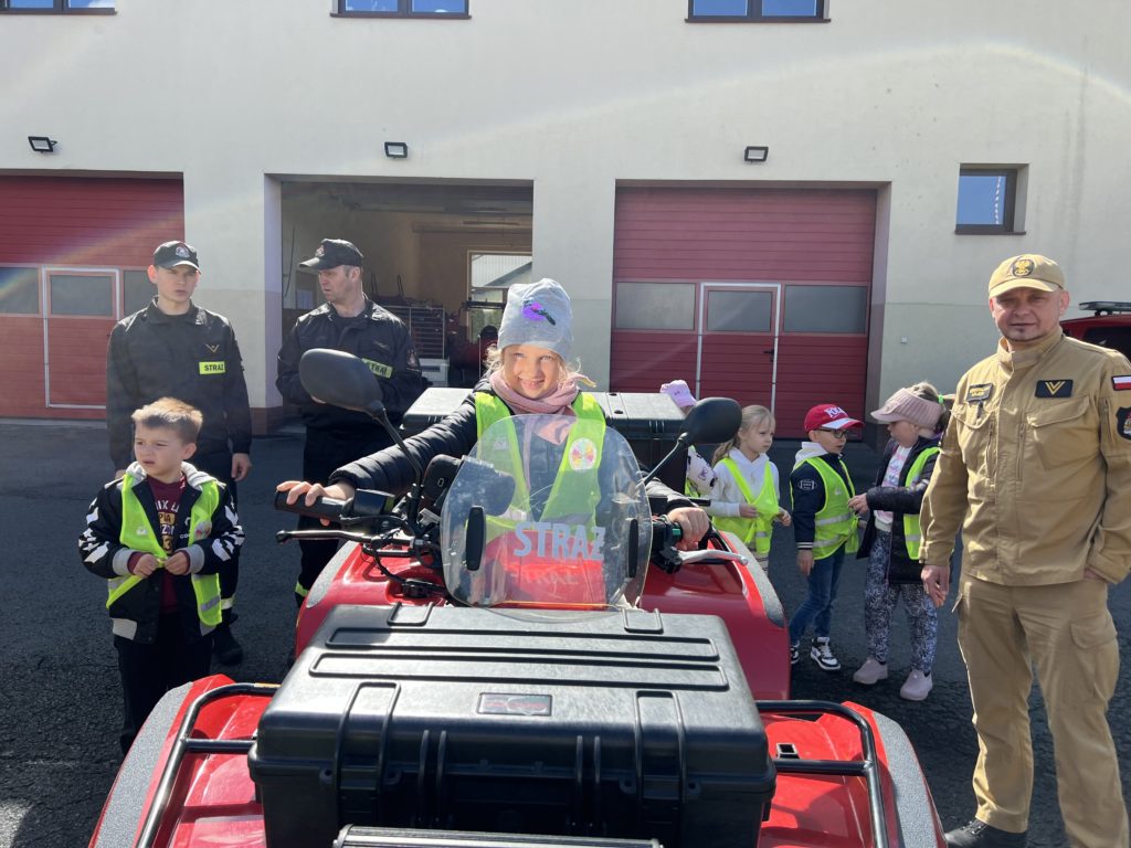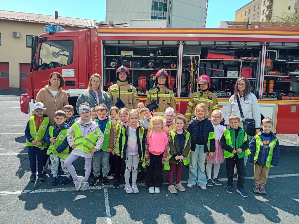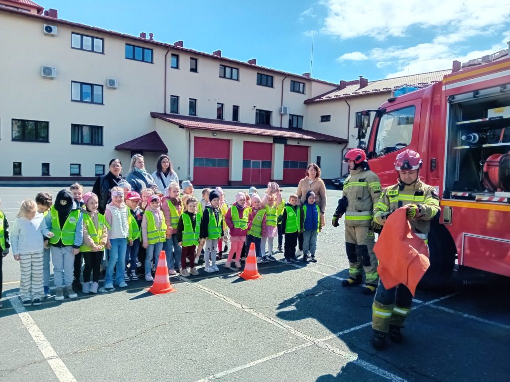 Dbanie o bezpieczeństwo swoje oraz innych to jeden z celów podstawy programowej, które dzieci muszą poznać. Dziecko powinno wiedzieć jak zachować się w sytuacji zagrożenia, pożaru oraz do kogo zwrócić się o pomoc. Aby zrealizować te cele grupy:  „Biedronki” oraz „Zajączki“ w maju udały się do Państwowej Straży Pożarnej. Dzieci zwiedziły budynek , dowiedziały się wielu informacji dotyczących pracy strażaka, wysłuchały którymi pojazdami strażacy wyjeżdżają do wypadków, a jakimi gaszą pożary. Mogły usiąść na quadzie strażackim. Obejrzały również wyposażenie pojazdów oraz niezbędne do pracy urządzenia specjalistyczne (w tym mogły zobaczyć jak w praktyce strażacy używają m.in. nożyc hydraulicznych do „rozcięcia“ auta.  Mogły przymierzyć hełm strażacki oraz zobaczyć jak strażak w razie alarmu zjeżdża z rury. Wszystkie dzieci teraz dokładnie wiedzą jaki jest numer alarmowy do straży pożarnej. Po takiej wycieczce wszystkie dzieciaki zgodnie przyznały, że ten zawód bardzo im się podoba, a niejedno dziecko w przyszłości chciałoby zostać strażakiem.