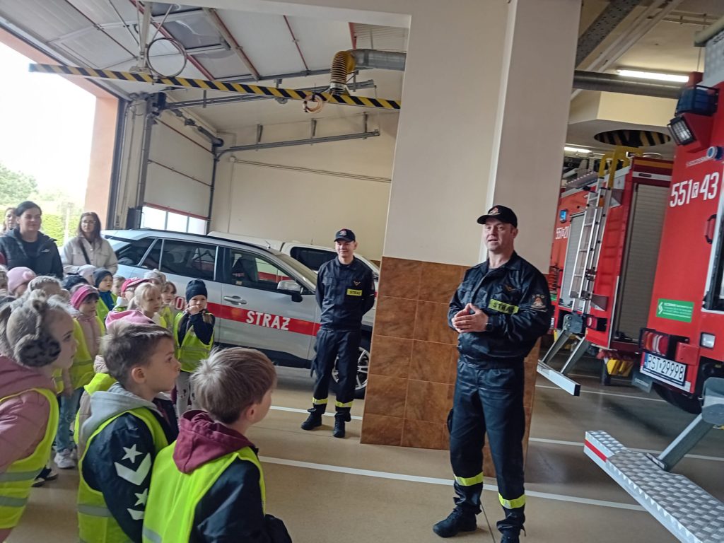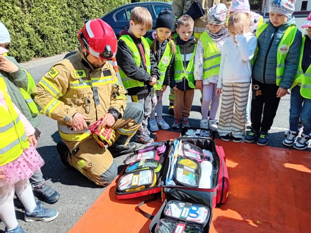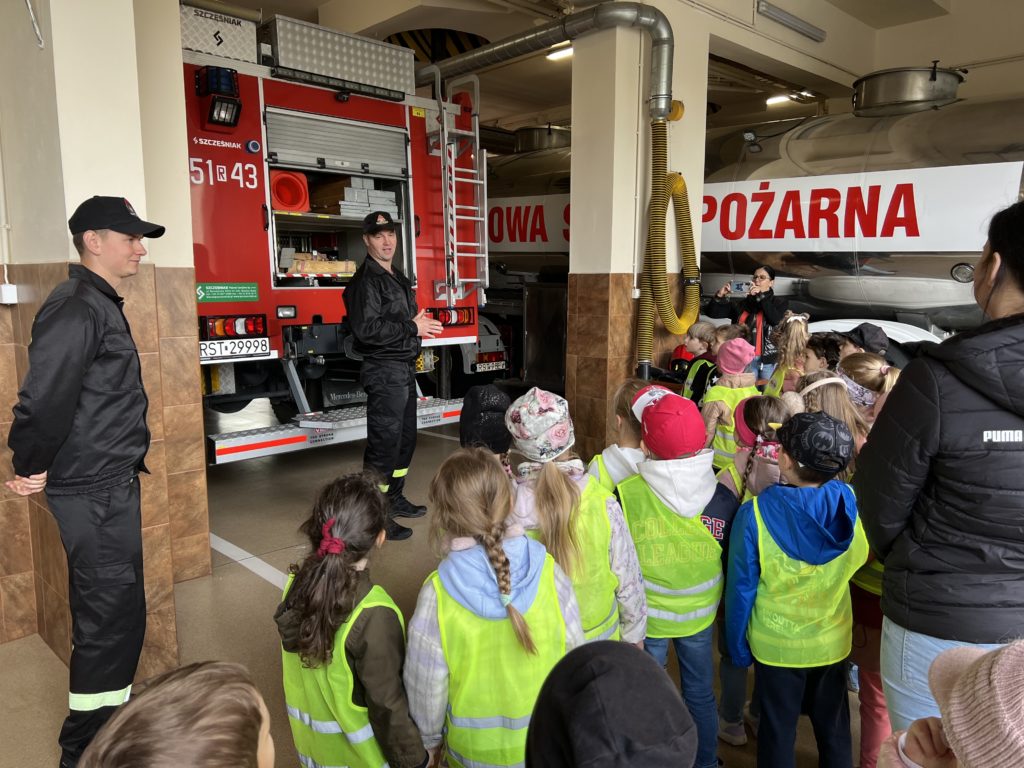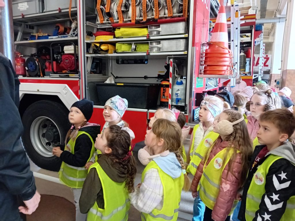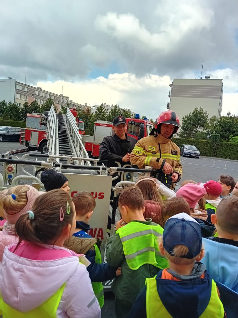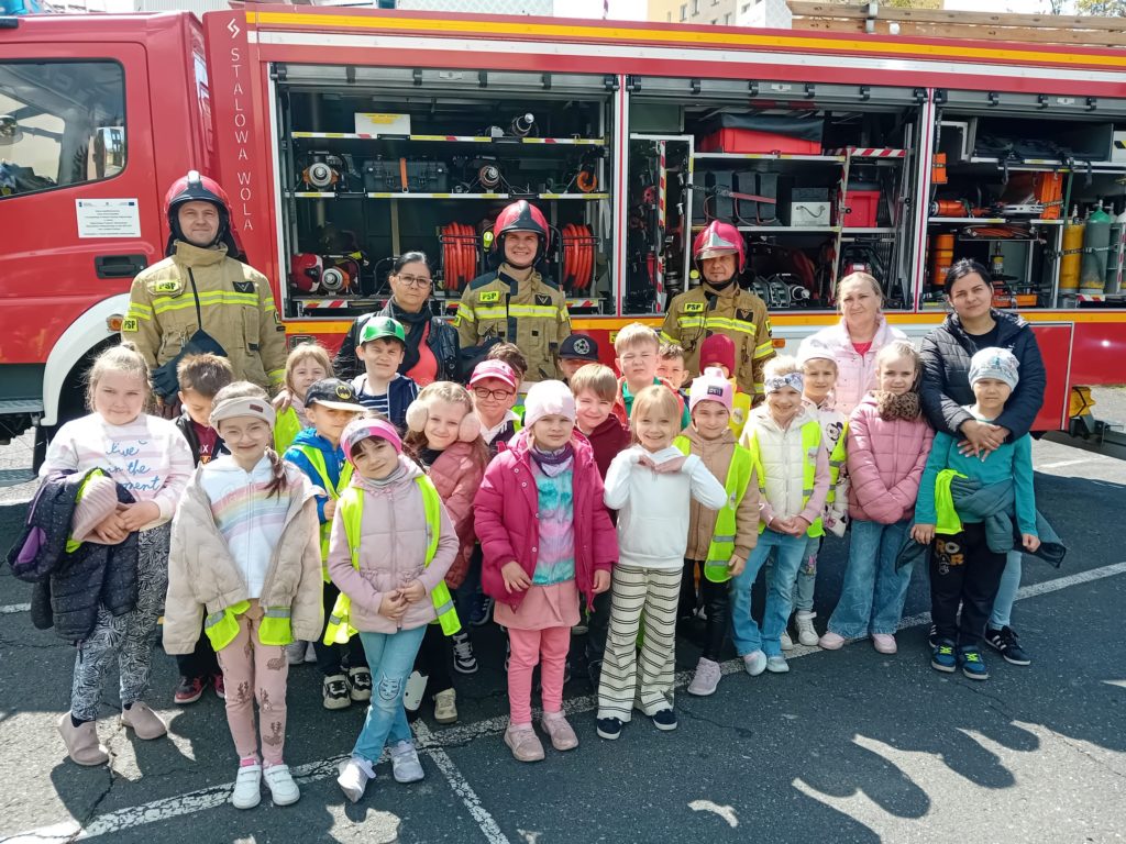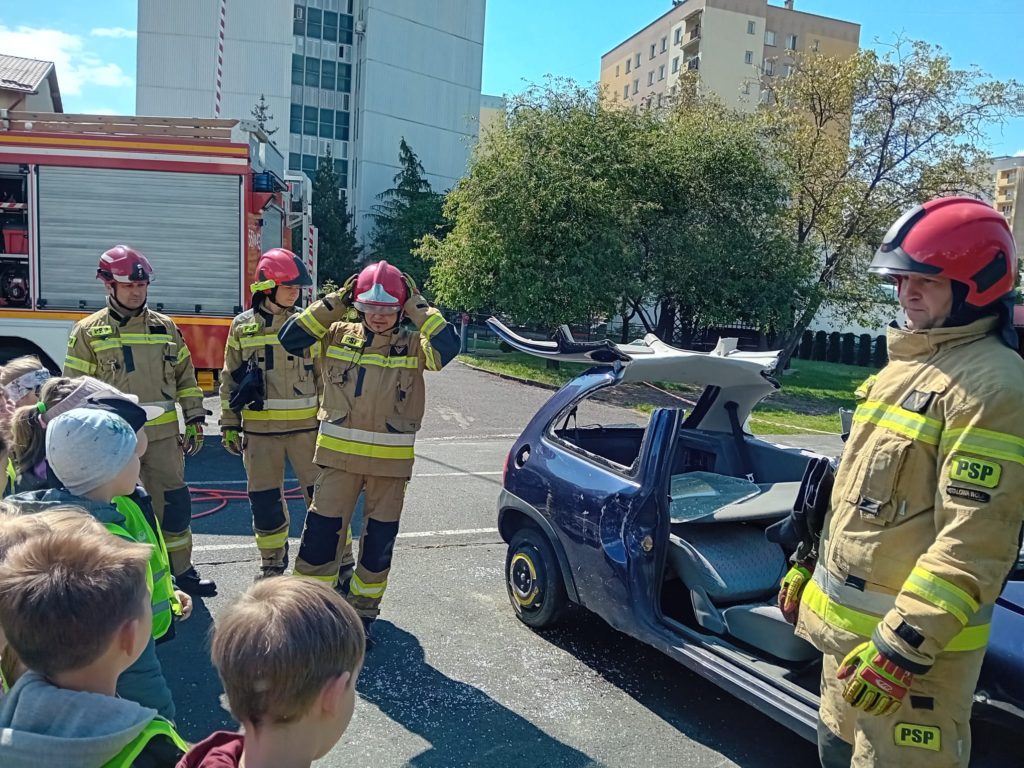 Dbanie o bezpieczeństwo swoje oraz innych to jeden z celów podstawy programowej, które dzieci muszą poznać. Dziecko powinno wiedzieć jak zachować się w sytuacji zagrożenia, pożaru oraz do kogo zwrócić się o pomoc. Aby zrealizować te cele grupy:  „Biedronki” oraz „Zajączki“ w maju udały się do Państwowej Straży Pożarnej. Dzieci zwiedziły budynek , dowiedziały się wielu informacji dotyczących pracy strażaka, wysłuchały którymi pojazdami strażacy wyjeżdżają do wypadków, a jakimi gaszą pożary. Mogły usiąść na quadzie strażackim. Obejrzały również wyposażenie pojazdów oraz niezbędne do pracy urządzenia specjalistyczne (w tym mogły zobaczyć jak w praktyce strażacy używają m.in. nożyc hydraulicznych do „rozcięcia“ auta.  Mogły przymierzyć hełm strażacki oraz zobaczyć jak strażak w razie alarmu zjeżdża z rury. Wszystkie dzieci teraz dokładnie wiedzą jaki jest numer alarmowy do straży pożarnej. Po takiej wycieczce wszystkie dzieciaki zgodnie przyznały, że ten zawód bardzo im się podoba, a niejedno dziecko w przyszłości chciałoby zostać strażakiem.
