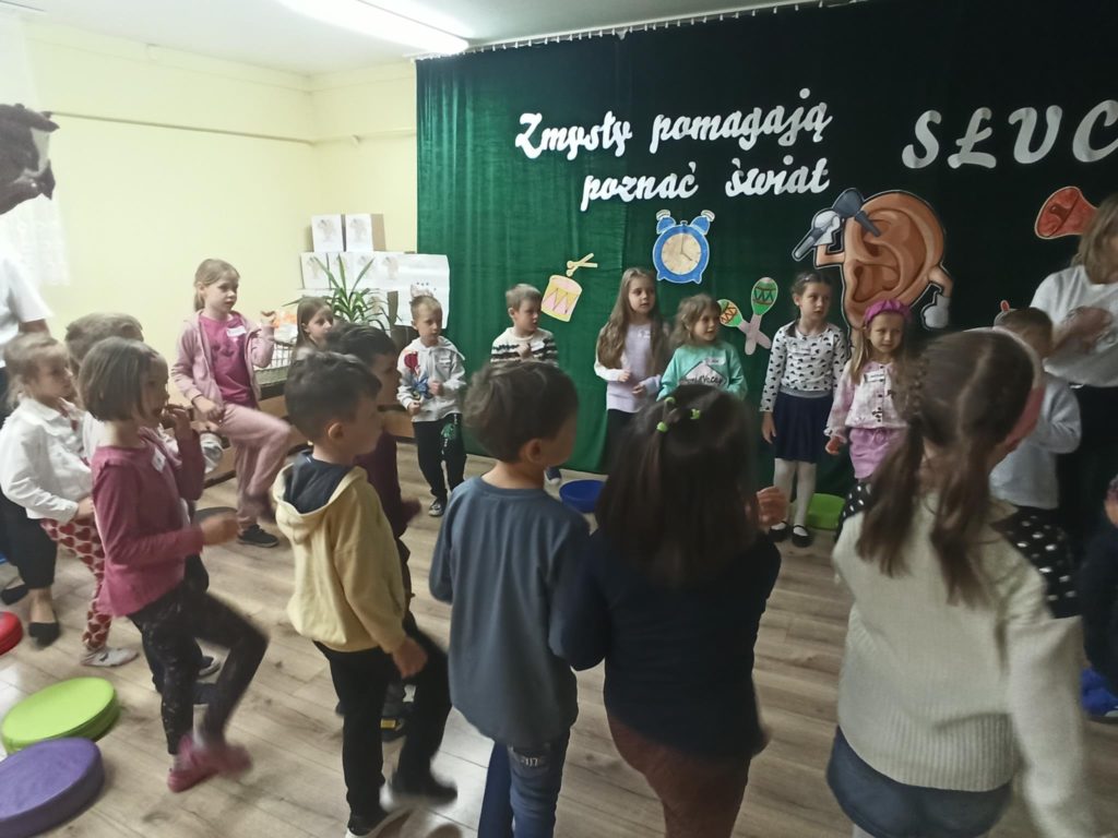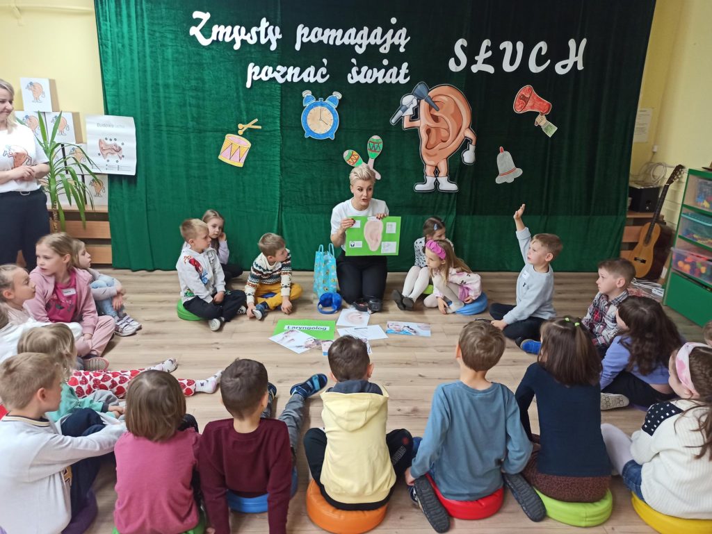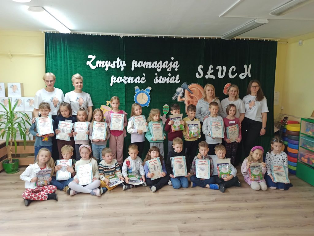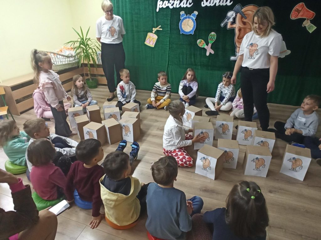 W maju dzieci z grupy „Biedronki“ udały się do Przedszkola nr. 9 i wzięły udział w warsztatach między przedszkolnych pt: „Zmysły pomagają poznać świat. Słuch.“ Dzieci zapoznały się z budową ucha oraz dowiedziały się jak bardzo jest nam on potrzebny , a także jak trzeba o niego dbać. Podczas warsztatów dzieci miały okazje min.: zobaczyć niezwykły teatr – bez słów, a z użyciem dźwięków, mogły zagrać na niecodziennych instrumentach, a także wykonać własne instrumenty. Warsztaty bardzo dzieciom się podobały.