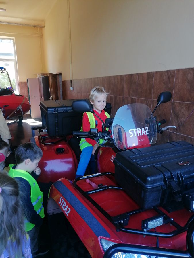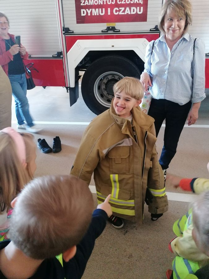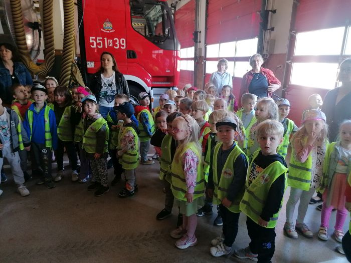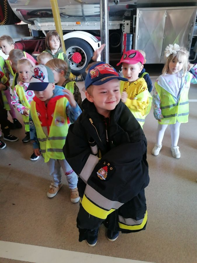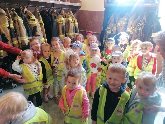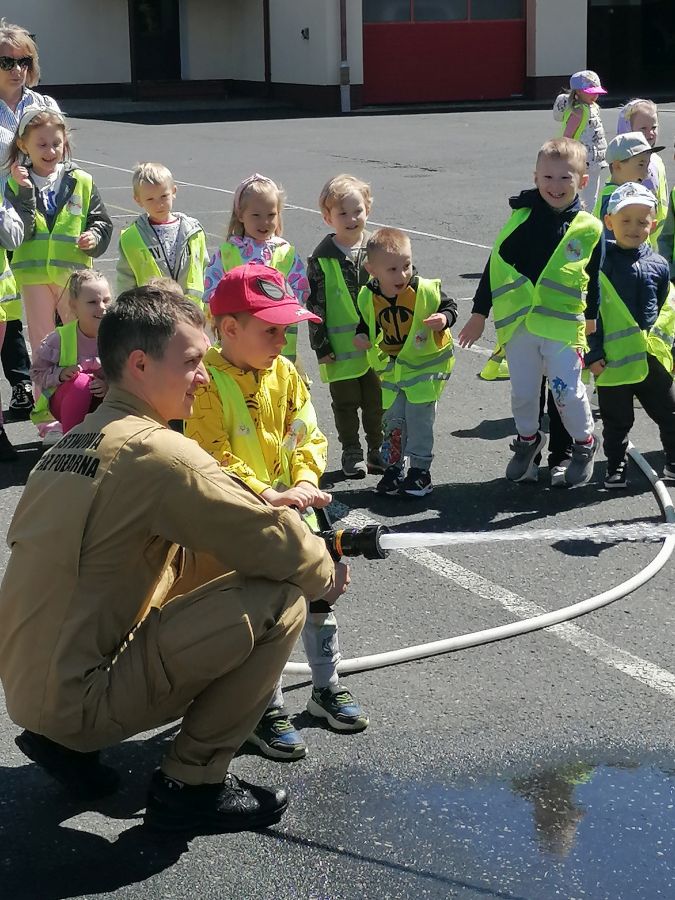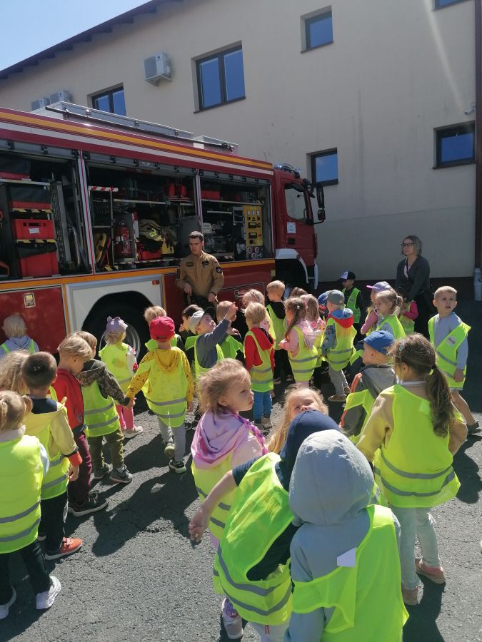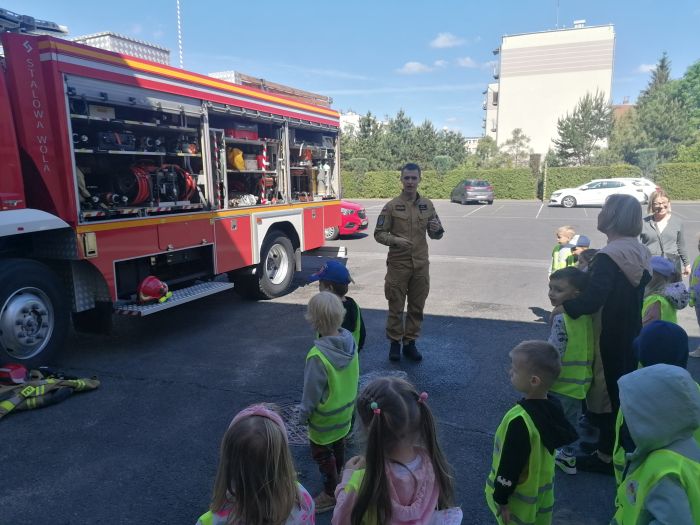Dzieci z grup „Krasnale”, „Misie” i „Motyle” w dniu 30.05.2025 odwiedziły jednostkę Państwowej Straży Pożarnej w Stalowej Woli. Dzieci zwiedziły budynek, dowiedziały się wielu informacji na temat pracy strażaka, sprzętu strażackiego i wyposażenia wozów strażackich, podziwiały sprzęt i urządzenia używane przez strażaków. Dzieci przymierzały strój strażaka i zobaczyły jak podczas alarmu zjeżdża się z rury. Celem wycieczki było również kształtowanie u dzieci umiejętności reagowania w sytuacjach zagrożenia i szacunku dla strażaków, uświadomienie trudnej, odpowiedzialnej i niebezpiecznej, ale zarazem satysfakcjonującej pracy strażaka.
