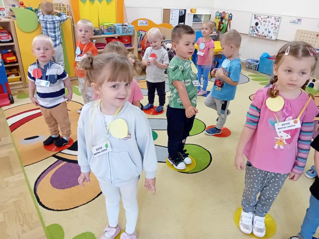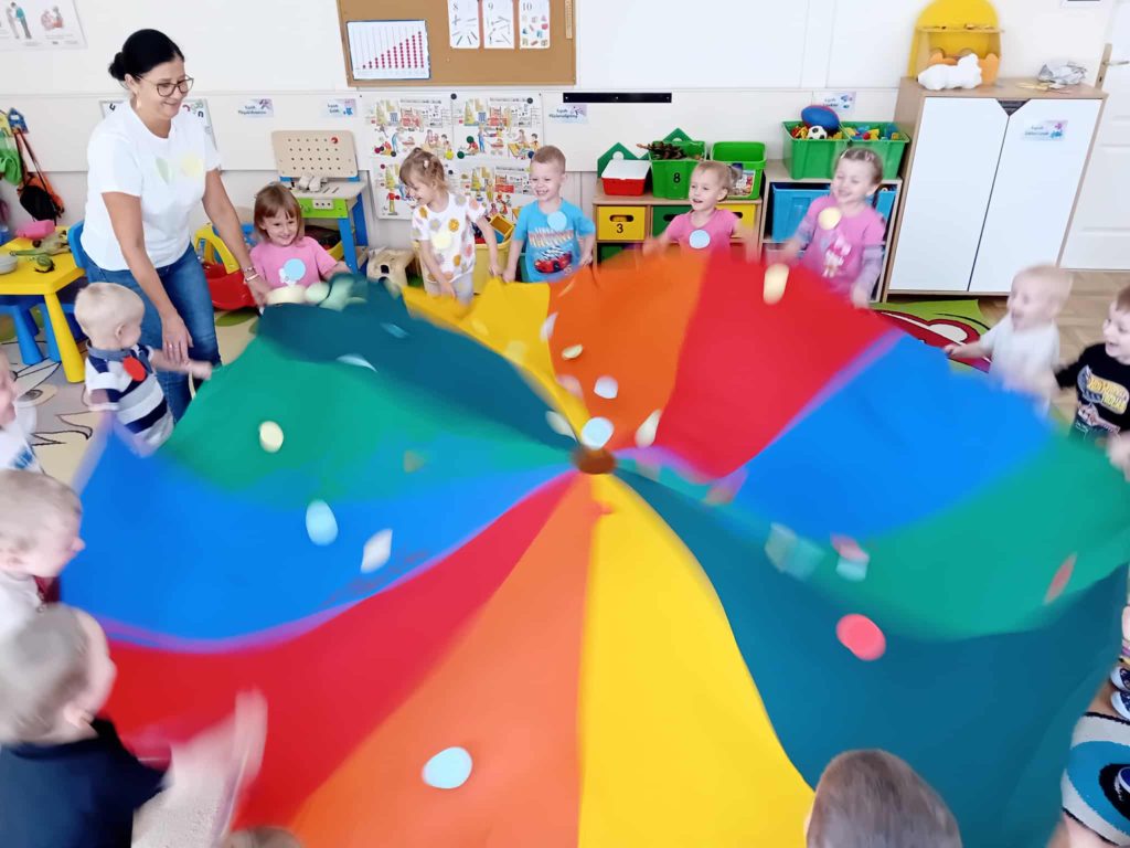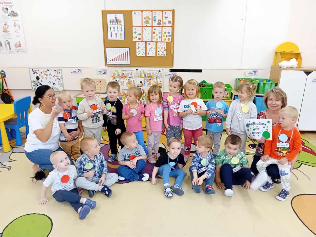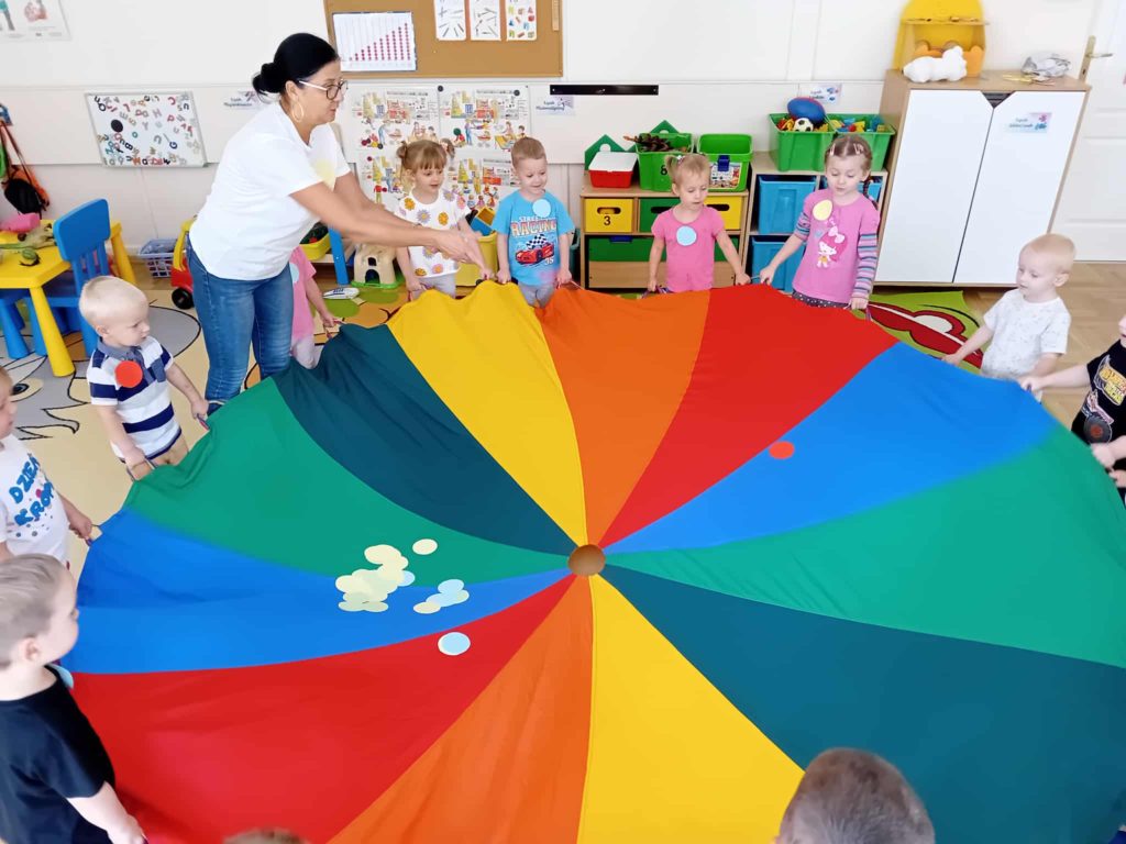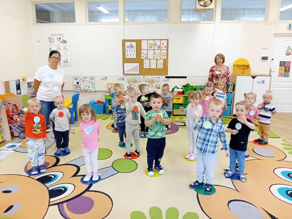 Dzieci tego dnia chętnie uczestniczyły w zabawach i zadaniach oczywiście z kropką w roli głównej. Malowały paluszkiem umoczonym w farbie kropki na przedstawionych obrazkach. W rytmie muzyki uczestniczyły w zabawach, które wzmocniły ich umiejętności ruchowe. Odbyło się losowanie kolorowych kropek -dzieci utrwaliły znajomość podstawowych kolorów. Dużą radość sprawiła dzieciom zabawa – „Kropka do kropki” oraz zabawa z chustą animacyjną – podrzucanie kolorowych kropek, wyciętych z kolorowego papieru. Na koniec dzieci otrzymały kupony motywacyjne. Było ,,Kropkowo” i radośnie.