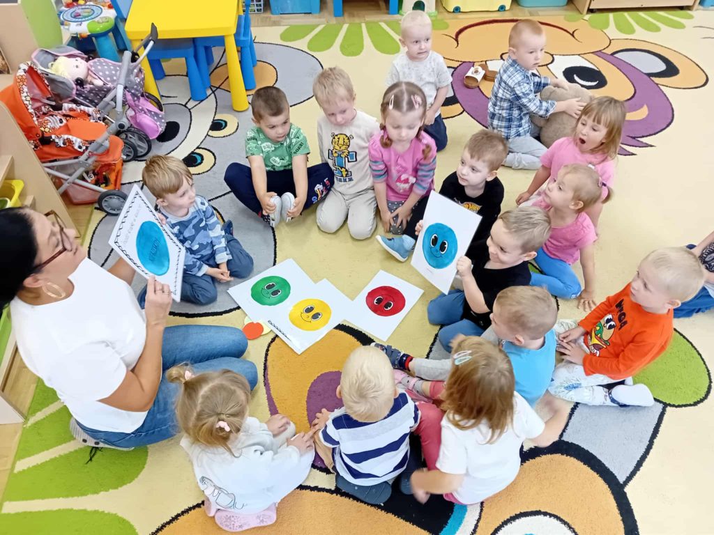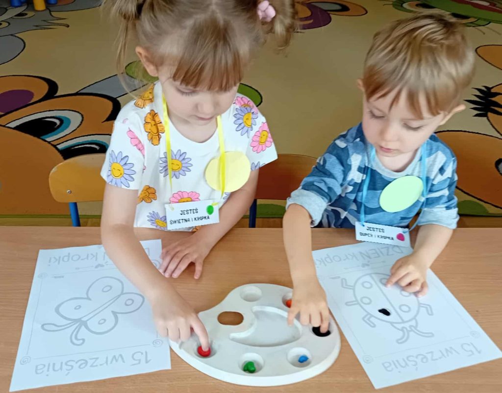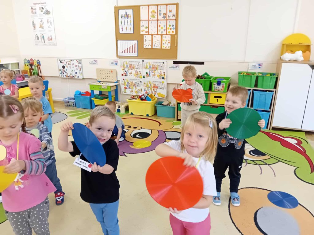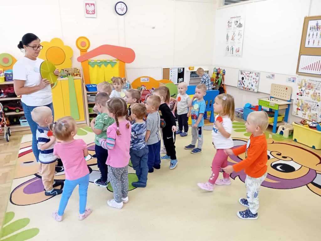 Dzieci tego dnia chętnie uczestniczyły w zabawach i zadaniach oczywiście z kropką w roli głównej. Malowały paluszkiem umoczonym w farbie kropki na przedstawionych obrazkach. W rytmie muzyki uczestniczyły w zabawach, które wzmocniły ich umiejętności ruchowe. Odbyło się losowanie kolorowych kropek -dzieci utrwaliły znajomość podstawowych kolorów. Dużą radość sprawiła dzieciom zabawa – „Kropka do kropki” oraz zabawa z chustą animacyjną – podrzucanie kolorowych kropek, wyciętych z kolorowego papieru. Na koniec dzieci otrzymały kupony motywacyjne. Było ,,Kropkowo” i radośnie.