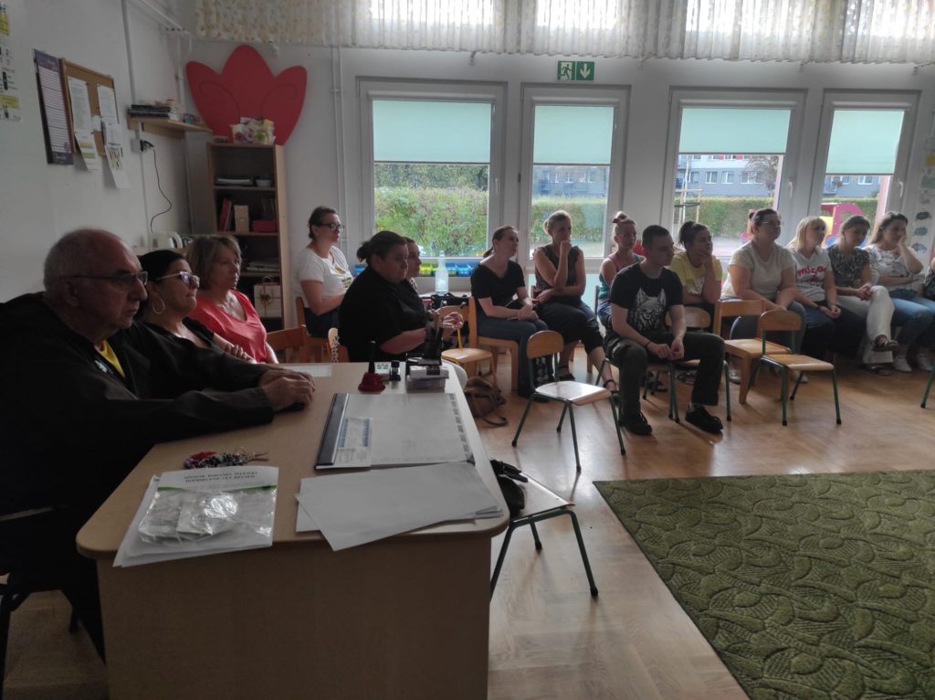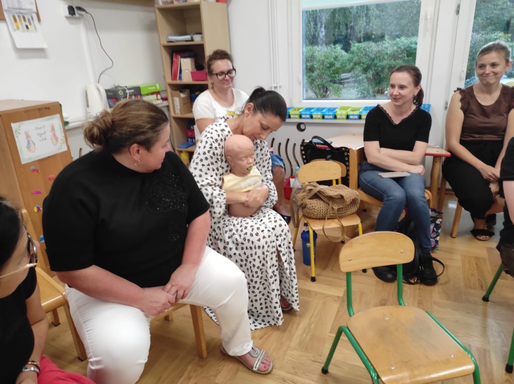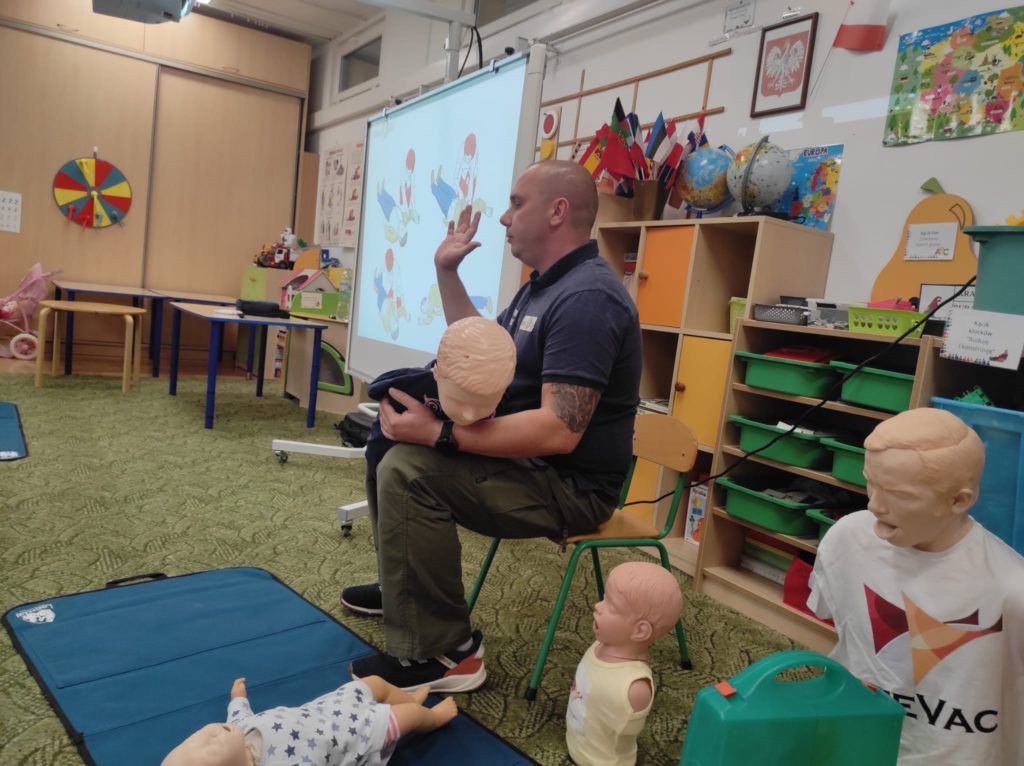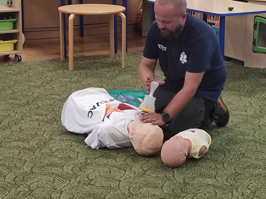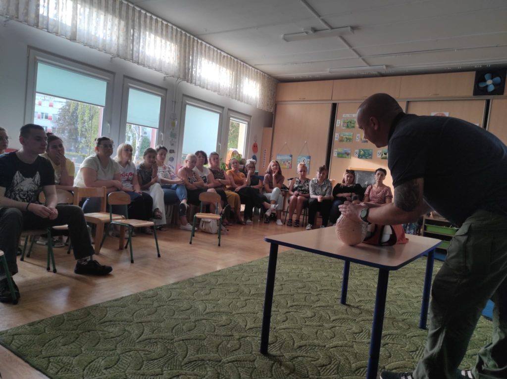 W dniu 10.09.2025r. w naszej placówce odbyło się szkolenie z pierwszej pomocy dla personelu przedszkola. Z uwagi na to, że bezpieczeństwo dzieci w placówce jest priorytetem, systematyczne szkolenia z zakresu udzielania pierwszej pomocy przedmedycznej umożliwiają nabycie wiedzy teoretycznej i umiejętności praktycznych w zakresie postępowania i odpowiedniego reagowania na występujące zagrożenia dla życia i zdrowia. Wykonywane przez personel ćwiczenia koncentrowały się na praktycznych umiejętnościach niezbędnych do skutecznej opieki nad dziećmi w przypadku nagłych sytuacji. Szkolenie obejmowało obszar reanimacji, udzielania pierwszej pomocy przedmedycznej, radzenia sobie z drobnymi obrażeniami, a także zagrożeniami specyficznymi dla najmłodszych podopiecznych np. szybkiego reagowania w przypadku zadławień czy korzystania ze sprzętu dostępnego w naszej placówce tj. zestawu LifeVac. Po skończonym szkoleniu pracownicy przedszkola zyskują pewność siebie i umiejętności, które są kluczowe w zapewnianiu bezpieczeństwa najmłodszym podopiecznym.