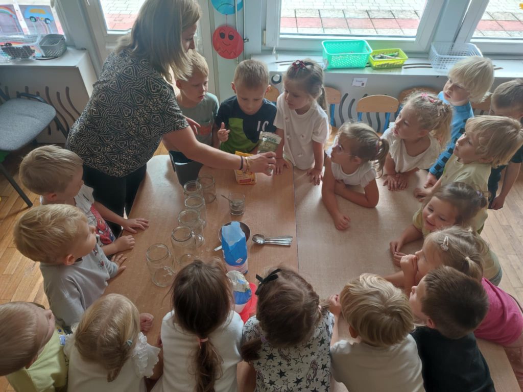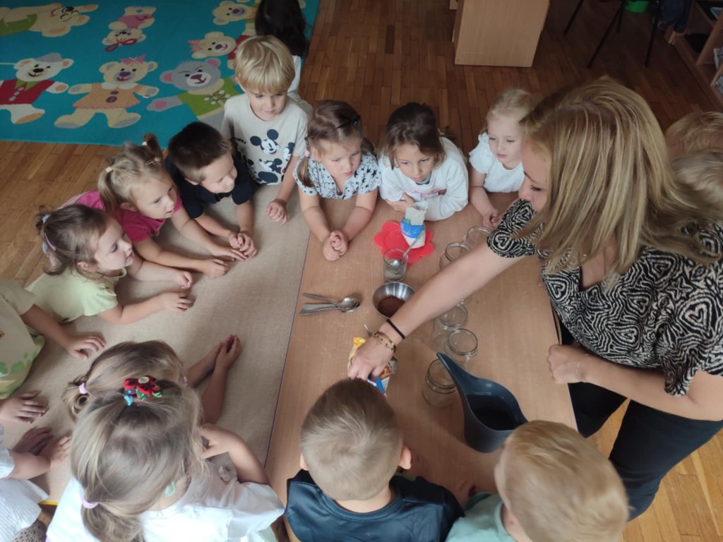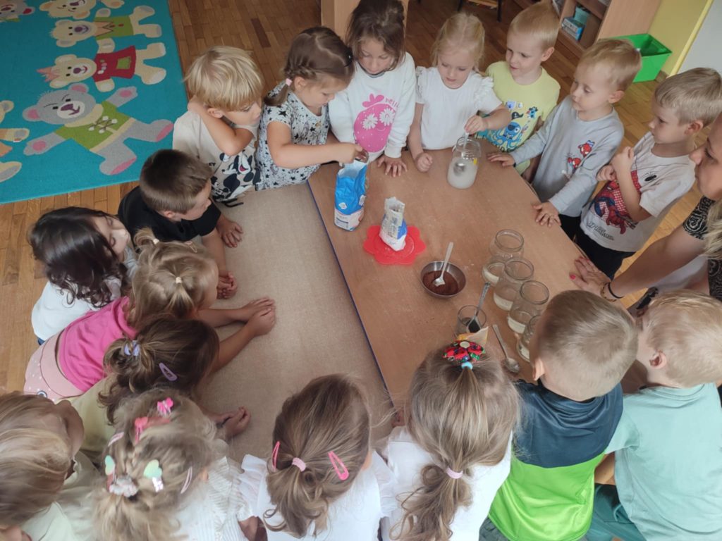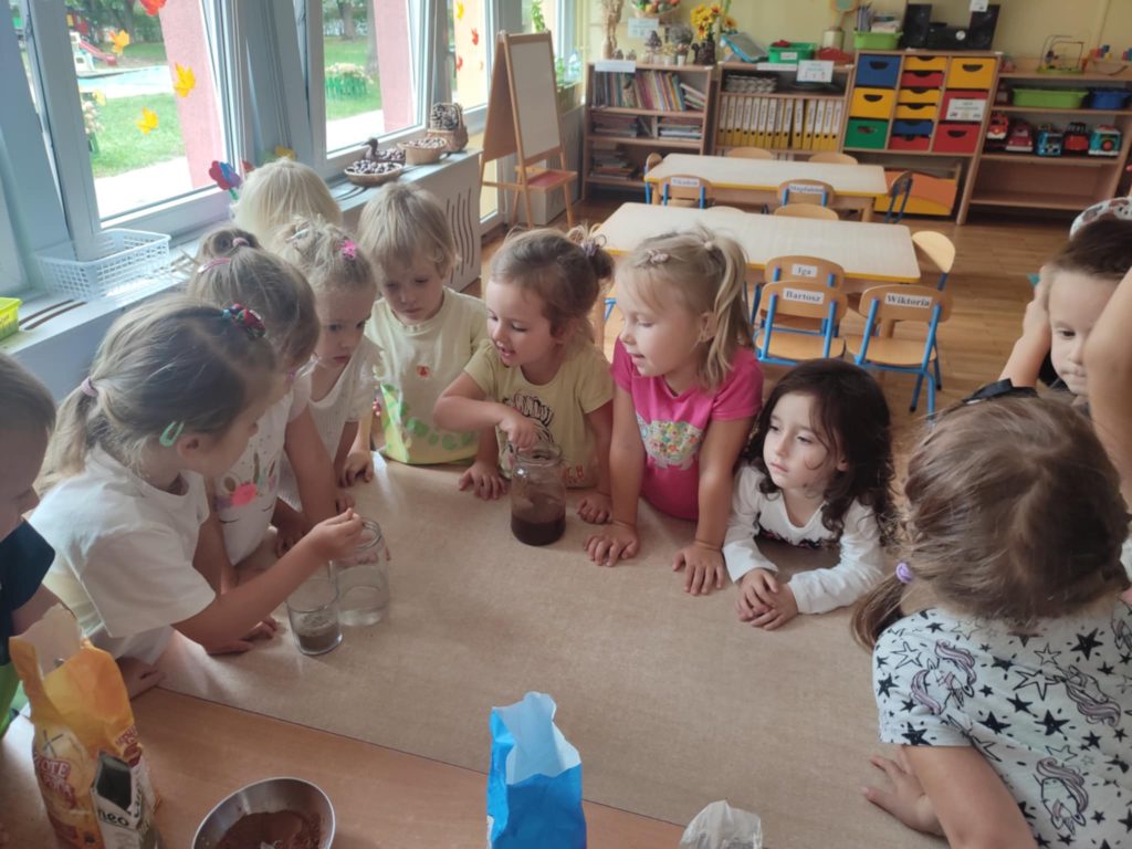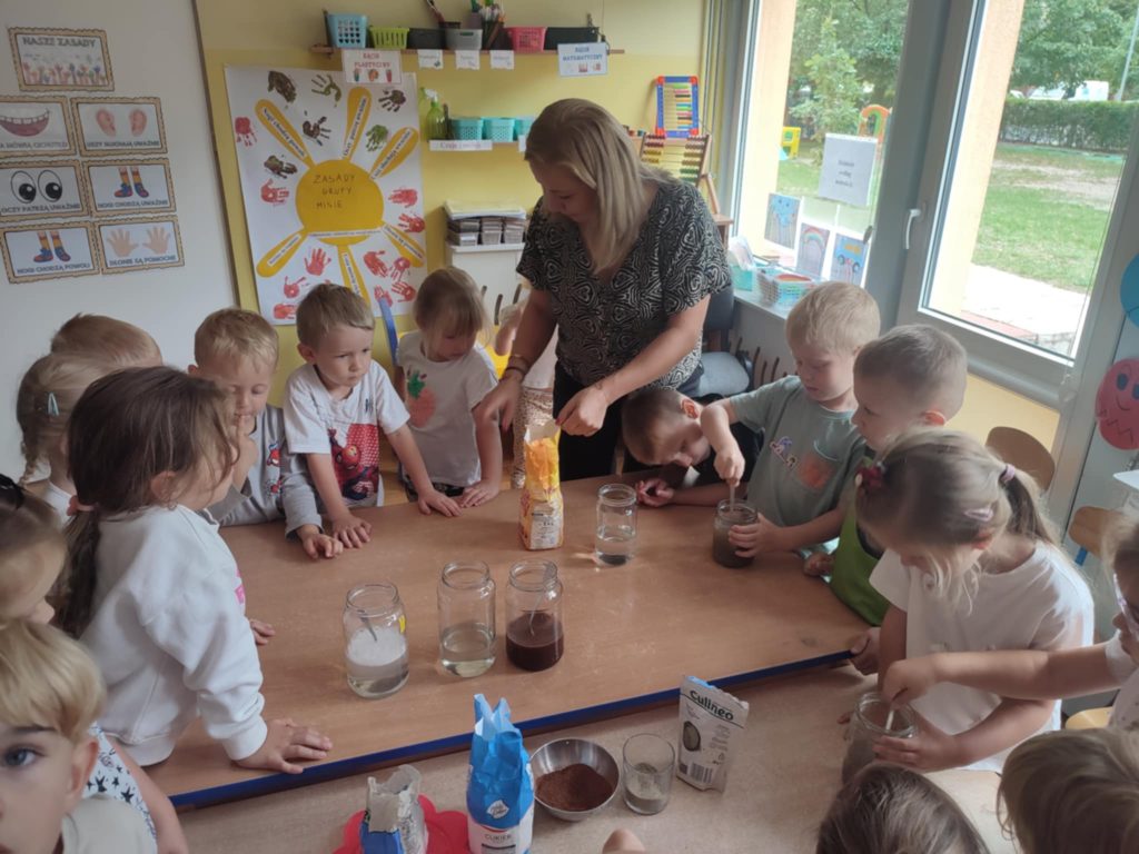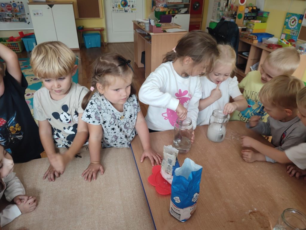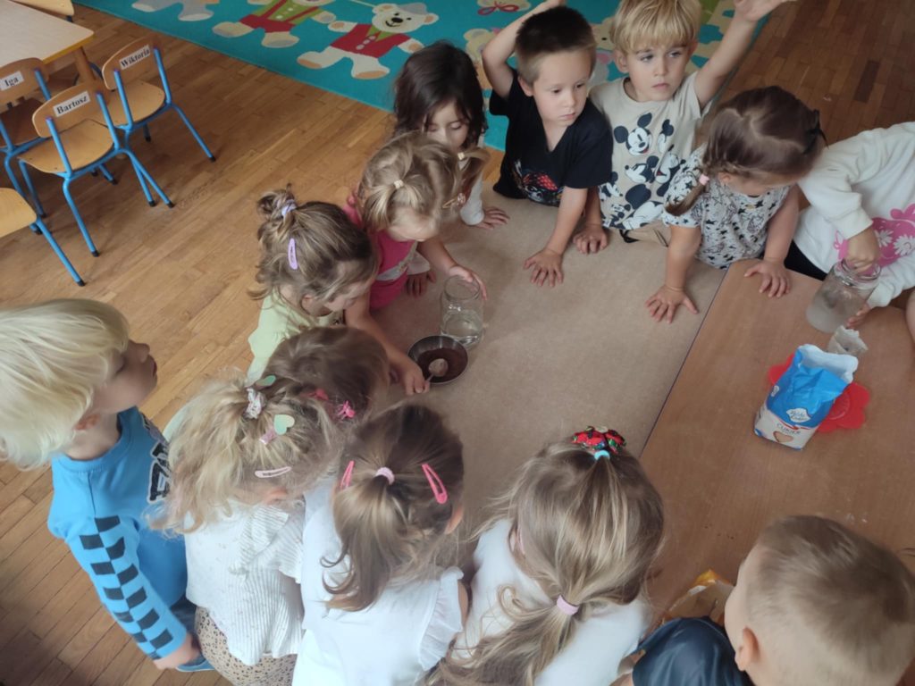 24.09.2025 r. dzieci z grupy ,,Misie”, w ramach realizacji programu ,,Badam, doświadczam, eksperymentuję”,aktywnie uczestniczyły w zabawach badawczych z wodą. Dzieci  poznawały właściwości wody (smak, zapach, kolor), badały czy coś rozpuszcza się w wodzie, czy nie. Po napełnieniu słoików wodą dzieci próbowały rozpuścić sól, cukier, piasek, kakao, pieprz i mąkę. ,,Misie” chętnie obserwowały i wyciągały wnioski z prowadzonych doświadczeń doskonaląc koncentrację uwagi, rozbudzając ciekawość otaczającego świata.