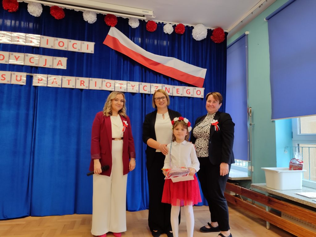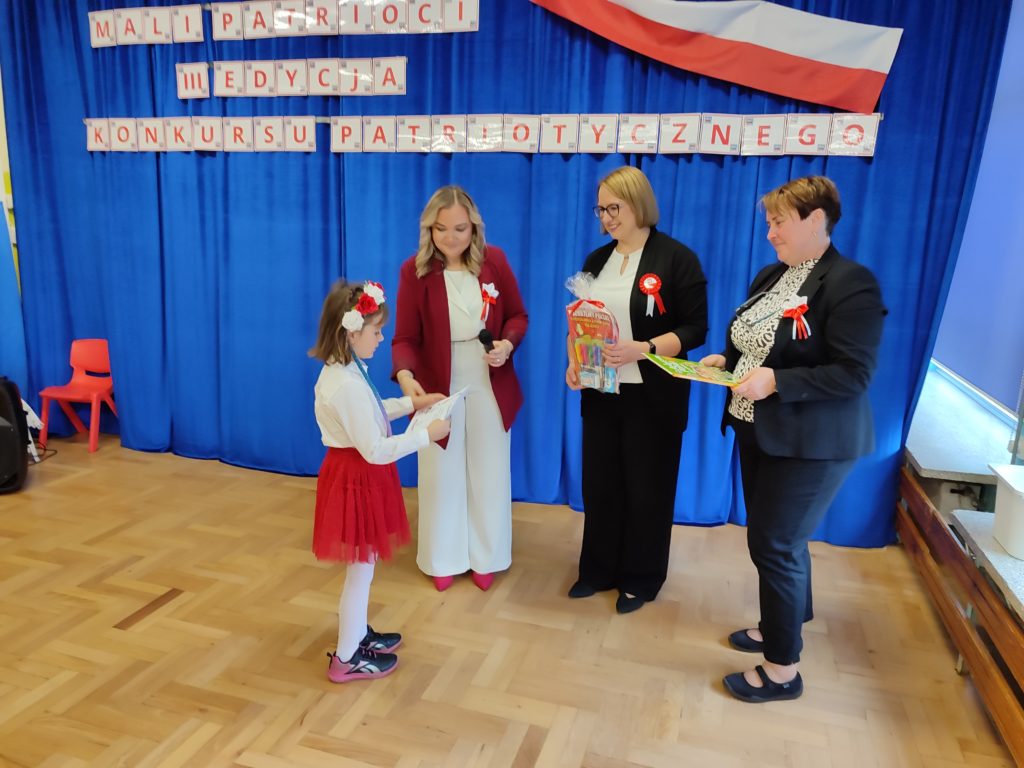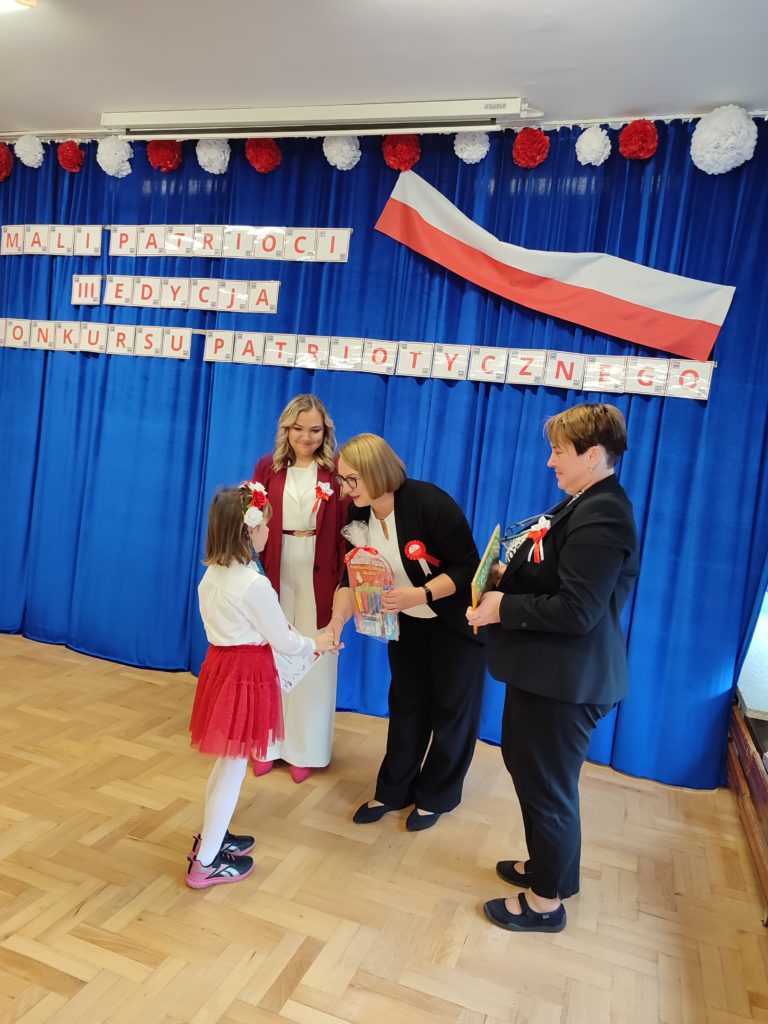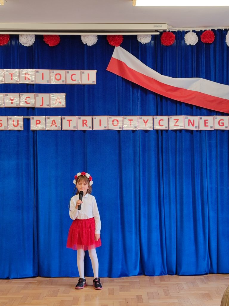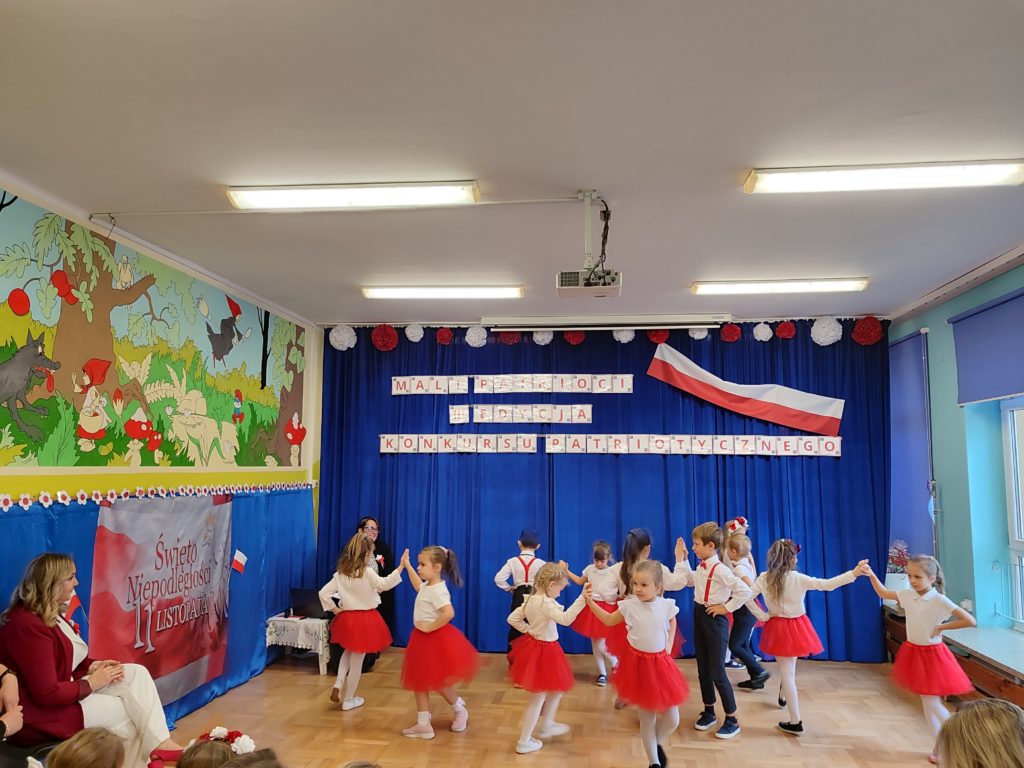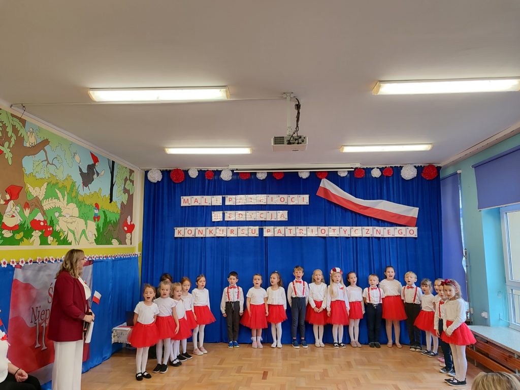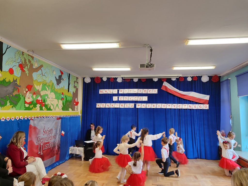 Dnia 6 listopada o godz. 9.30 odbył się występ ,,małych artystów’’ ze stalowowolskich przedszkoli. Przedszkolaki zaprezentowały piosenki patriotyczne z szacunkiem i dumą. Nasze przedszkole reprezentowała Ksenia Grusiecka z utworem :,,Jest takie miejsce Polska.” Ksenia zaśpiewała bardzo ładnie, wykazała się dużym zaangażowaniem oraz umiejętnie przekazała emocje towarzyszące temu utworowi. Przedszkolaki miały odświętne stroje w barwach narodowych, biało-czerwonych. Dzieci zaprezentowały utwory w poczuciu przynależności do ojczyzny. Śpiewały piosenki patriotyczne z godnością i miłością do ojczyzny. W dłoniach trzymały biało-czerwone chorągiewki. Podczas uroczystości z powagą odśpiewano hymn Polski ,,Mazurek Dąbrowskiego’’. Wszystkie dzieci dostały podziękowania za pięknie zaśpiewane pieśni patriotyczne. Przedszkolaki nagrodzone zostały książkami pt: ,,Poznajemy Polskę” i ,,Atlas Polski dla dzieci”. Wszyscy uczestnicy zostali zaproszeni na poczęstunek. Dzięki takim konkursom dzieci poszerzają wiedzę o historii Polski oraz symbolach narodowych. Uroczystość odbyła się w miłej i przyjaznej atmosferze oraz w poczuciu przynależności do ojczyzny.