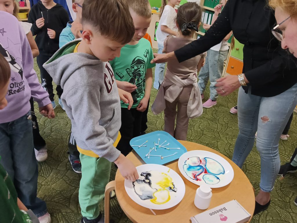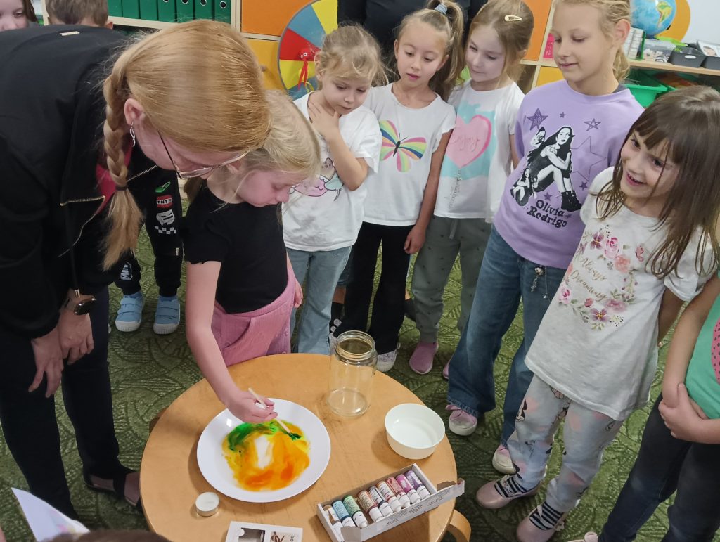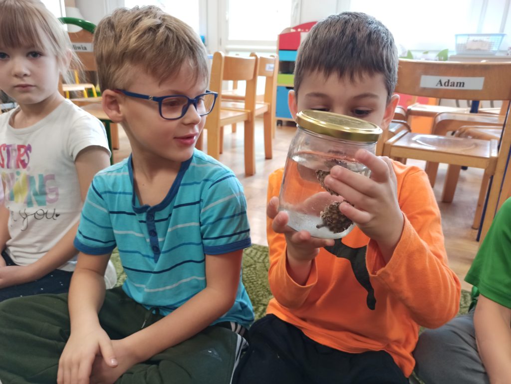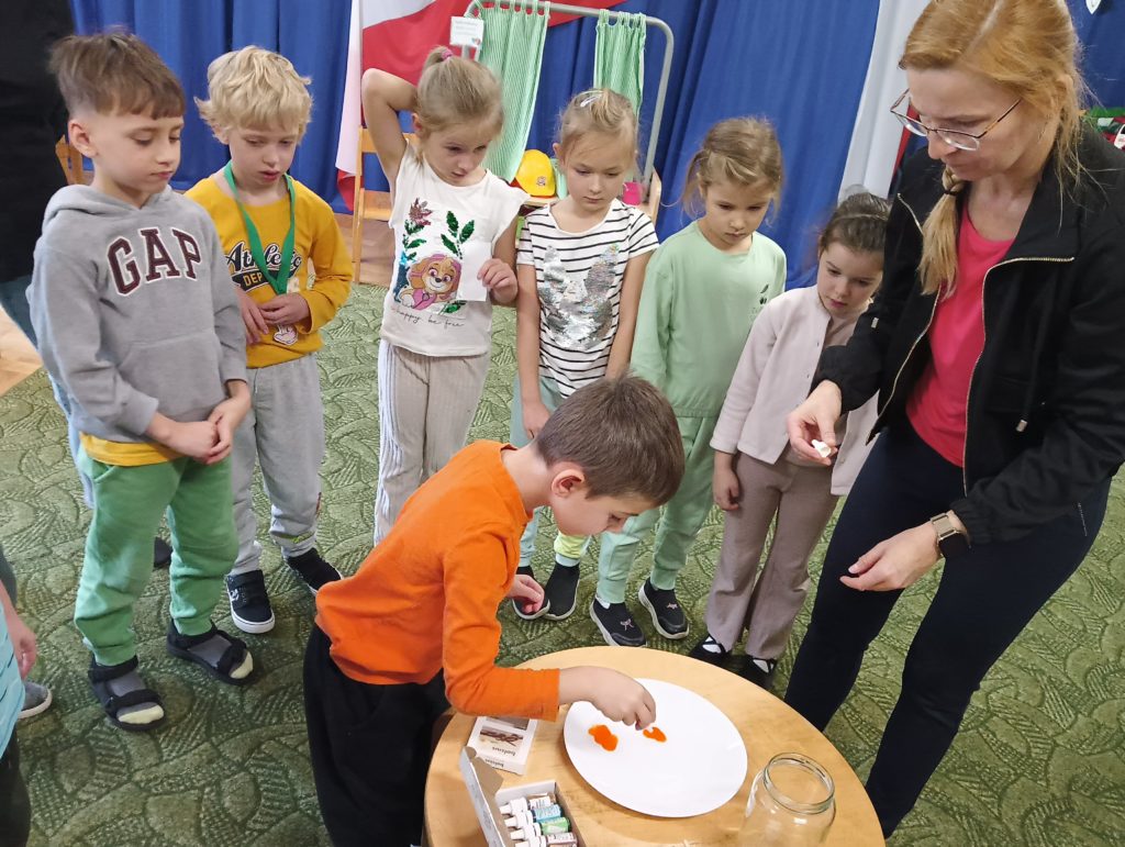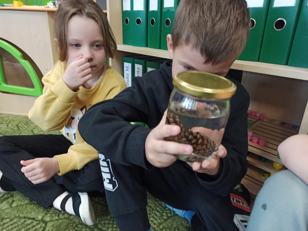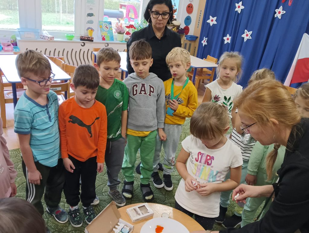 Kto powiedział, że jesień jest szara i ponura? Dzieci z grupy Zajączki codziennie doświadczają jej uroków. Tym razem Zajączki miały czas na eksperymentowanie podczas realizacji innowacji „Widzę, czuję, realizuje” połączonej z projektem edukacyjnym pt.: „Jesień zmysłami malowana”. Dzieci dowiedziały się, dlaczego szyszki w czasie deszczu się zamykają i co się stanie z nimi, kiedy wyschną, dowiedziały się jak działa różnica ciśnień podczas doświadczenia „Pompa słoikowa” oraz dlaczego kolory uciekają, kiedy znajdują się na mleku. Dzieci były bardzo zaciekawione i z ogromnym zapałem brały udział w obserwacji i doświadczeniach:).