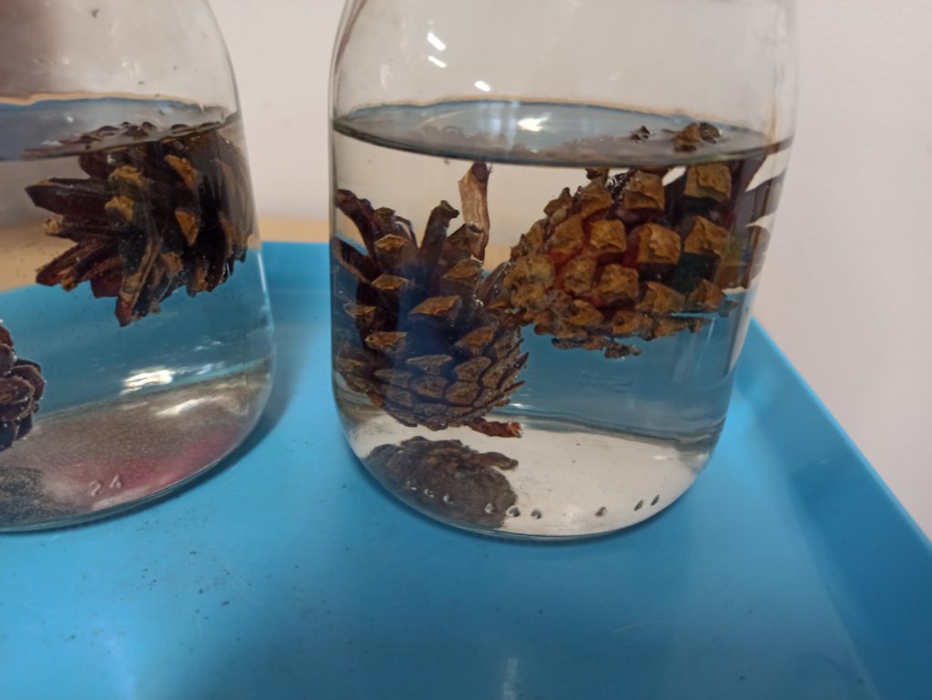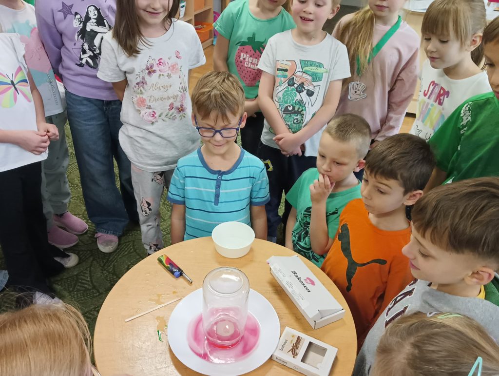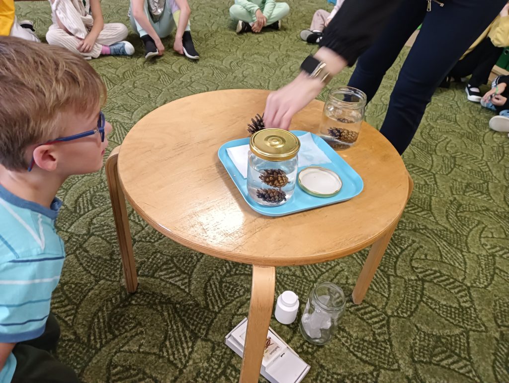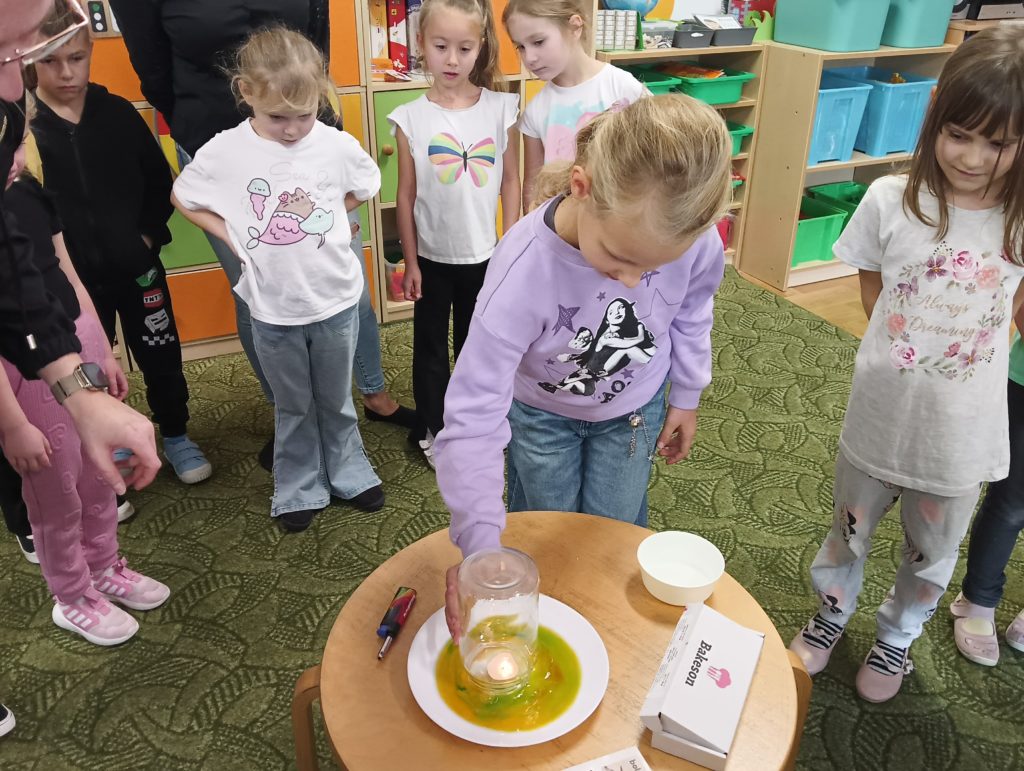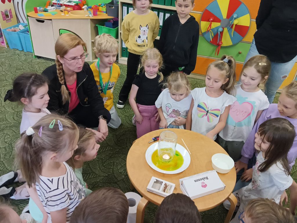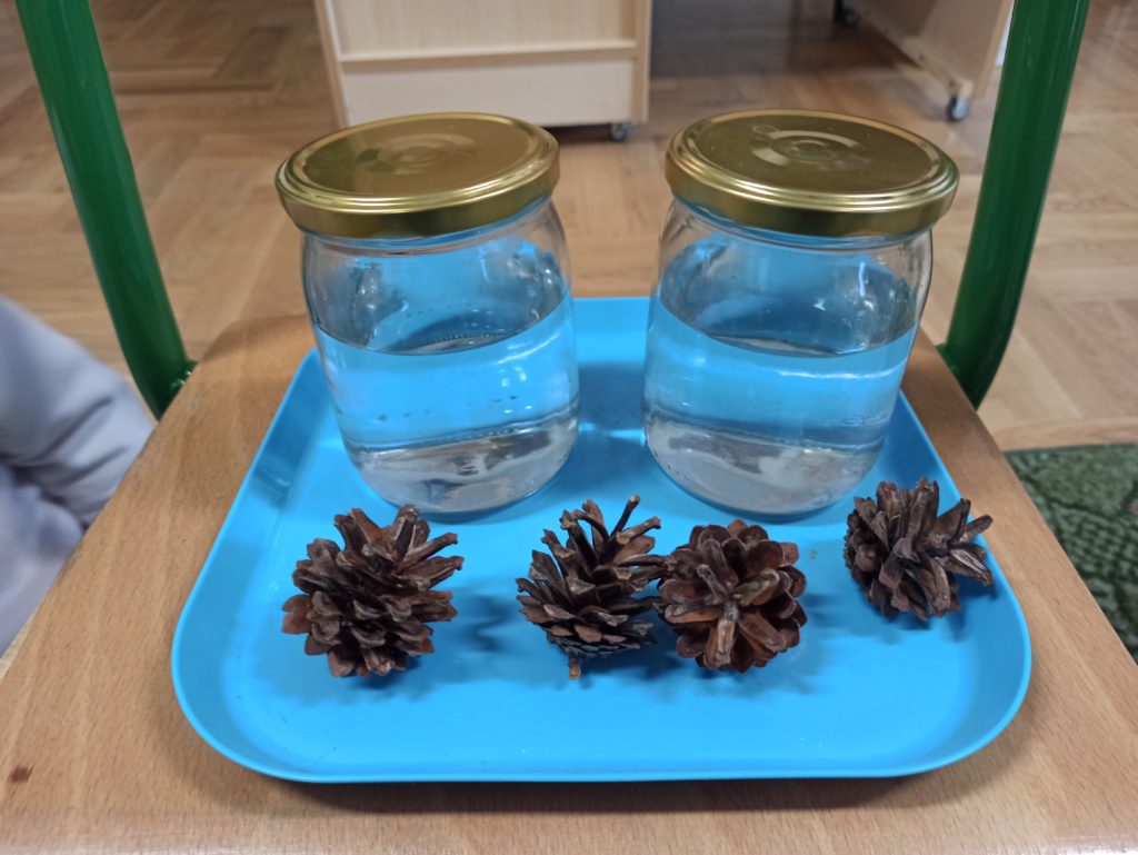 Kto powiedział, że jesień jest szara i ponura? Dzieci z grupy Zajączki codziennie doświadczają jej uroków. Tym razem Zajączki miały czas na eksperymentowanie podczas realizacji innowacji „Widzę, czuję, realizuje” połączonej z projektem edukacyjnym pt.: „Jesień zmysłami malowana”. Dzieci dowiedziały się, dlaczego szyszki w czasie deszczu się zamykają i co się stanie z nimi, kiedy wyschną, dowiedziały się jak działa różnica ciśnień podczas doświadczenia „Pompa słoikowa” oraz dlaczego kolory uciekają, kiedy znajdują się na mleku. Dzieci były bardzo zaciekawione i z ogromnym zapałem brały udział w obserwacji i doświadczeniach:).