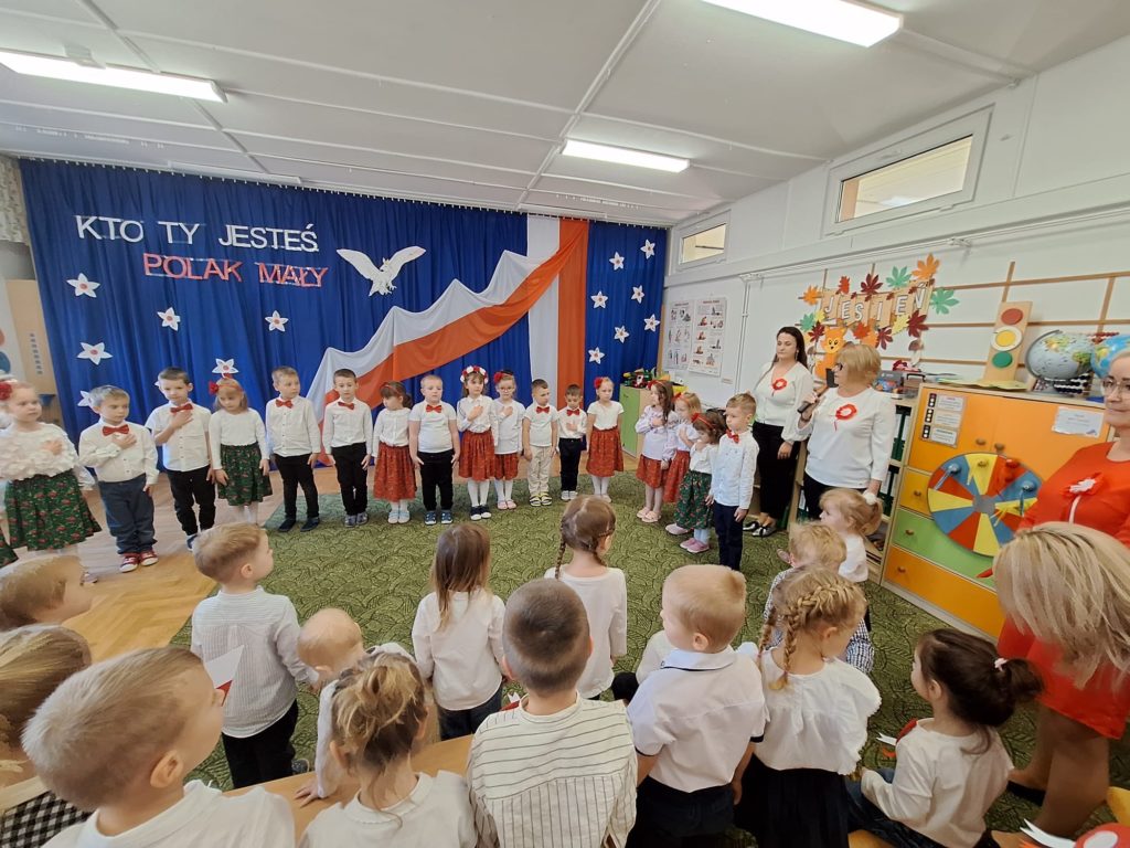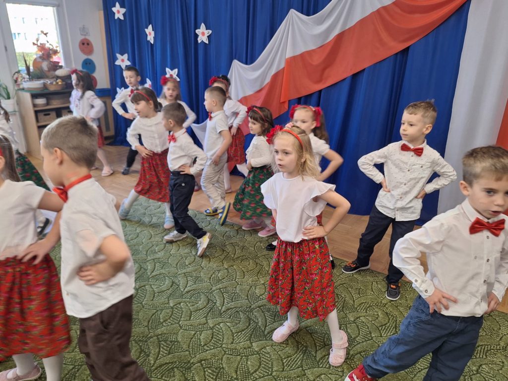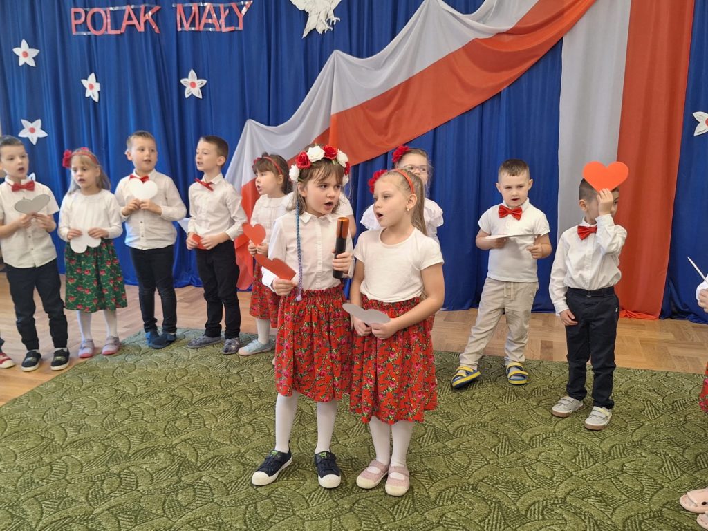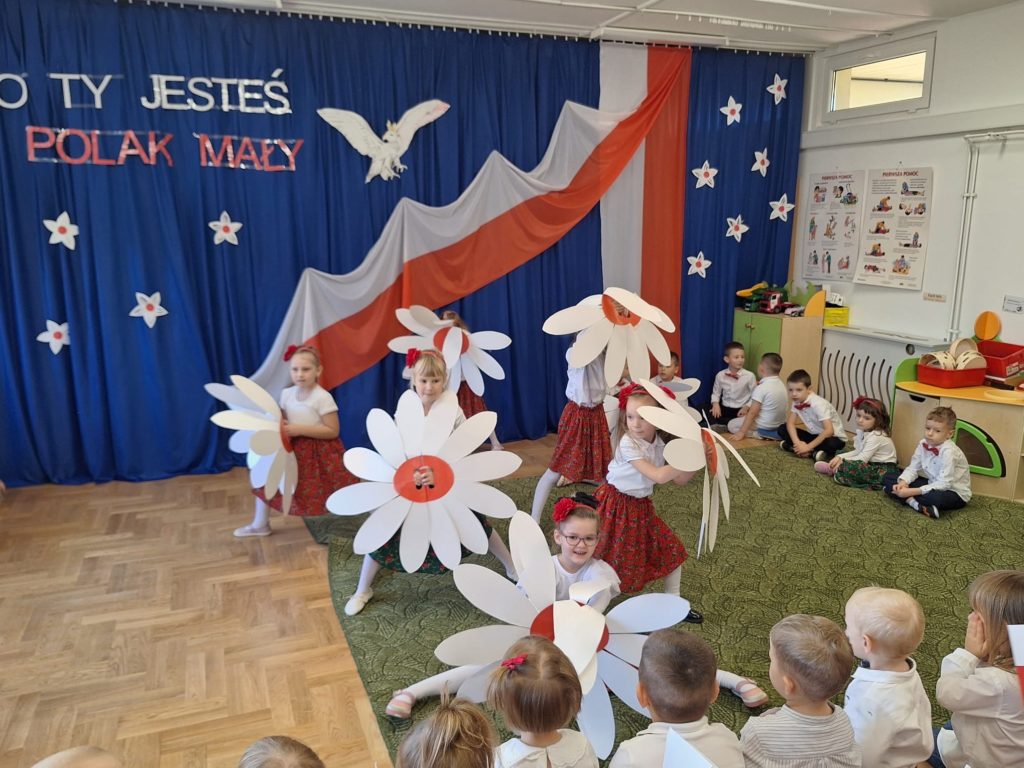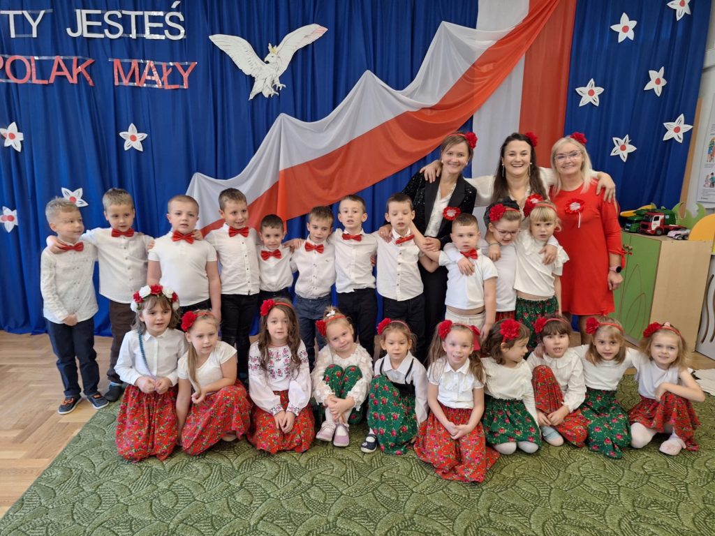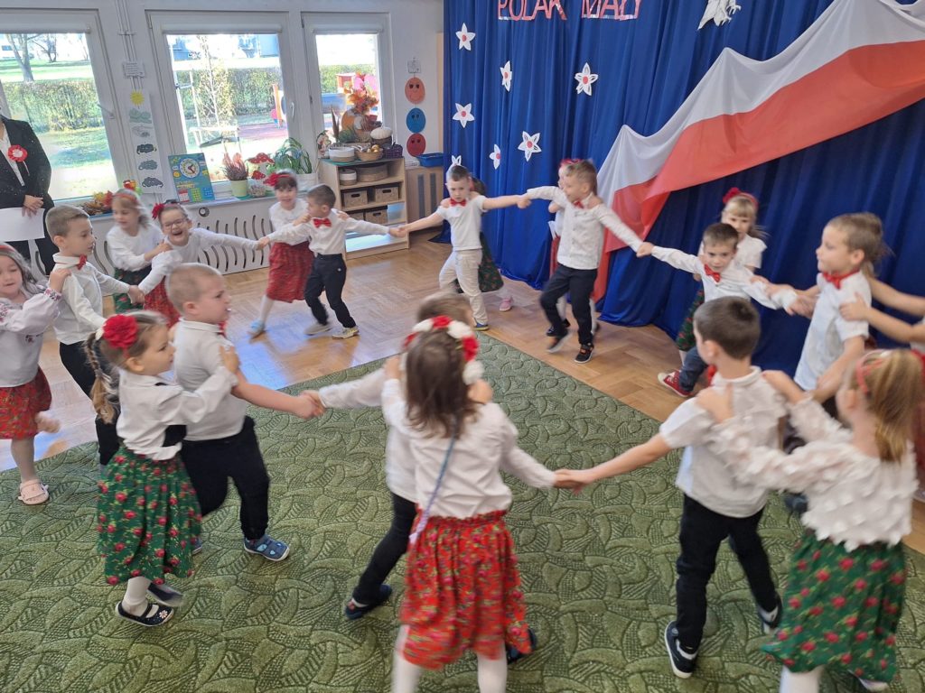 W piątek w naszym przedszkolu odbyła się wyjątkowa uroczystość z okazji Narodowego Święta Niepodległości, którą przygotowały dzieci z grupy „Motylki”. Przedszkolaki z dużym zaangażowaniem i dumą zaprezentowały program artystyczny pełen tańca, muzyki i patriotycznych wzruszeń. Dzieci wystąpiły w tradycyjnych polskich tańcach narodowych, takich jak polonez, kujawiak, oberek oraz krakowiak, prezentując piękno polskiej kultury i tradycji. Dziewczynki przedstawiły również poruszający taniec z kwiatami w biało-czerwonych barwach w nowoczesnej aranżacji. Podczas uroczystości nie zabrakło również pieśni i piosenek patriotycznych, które wprowadziły wszystkich w podniosły nastrój. Jednym z najbardziej wzruszających momentów było wspólne odśpiewanie piosenki „To Polska właśnie, to moje miejsce” przez całą społeczność przedszkolną. Nasze przedszkole włączyło się także w ogólnopolską akcję „Szkoła do hymnu”, w ramach której wszyscy zebrani odśpiewali cztery zwrotki Mazurka Dąbrowskiego. Był to piękny i poruszający moment wspólnoty oraz wyraz szacunku dla historii naszej Ojczyzny. Dziękujemy dzieciom z grupy „Motylki” za wspaniały występ, a nauczycielom oraz rodzicom za przygotowanie i wsparcie. To była uroczystość, którą z pewnością zapamiętamy na długo.
