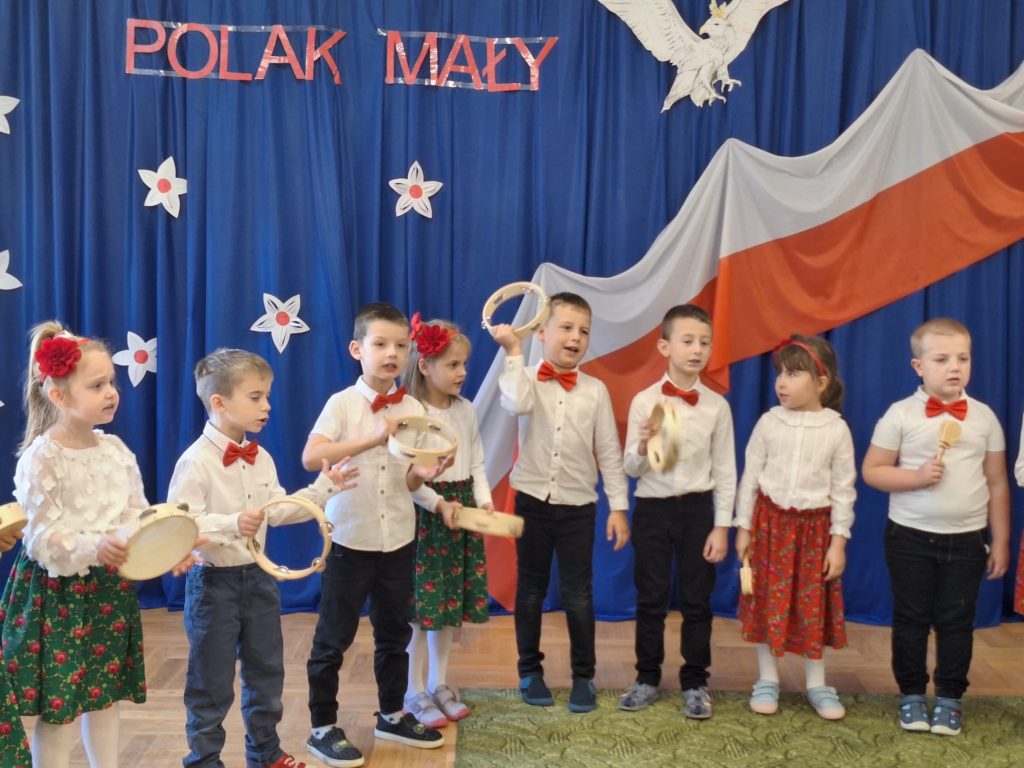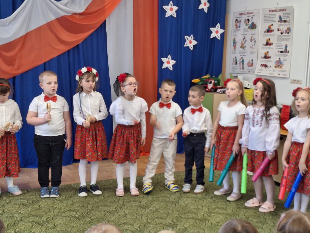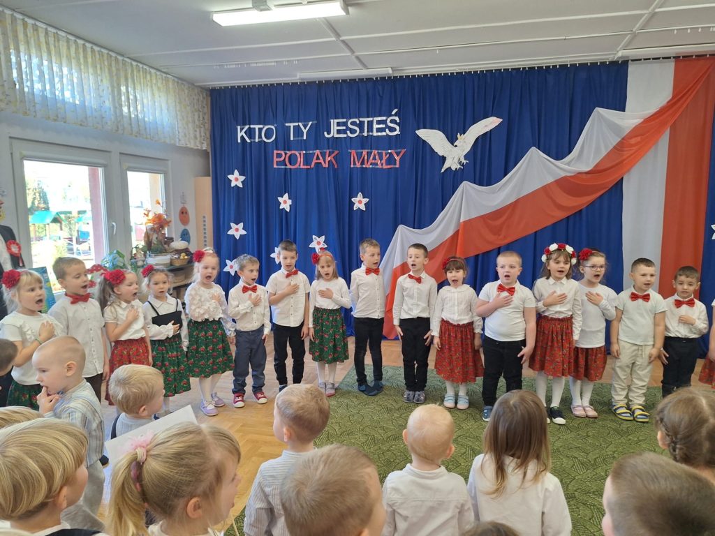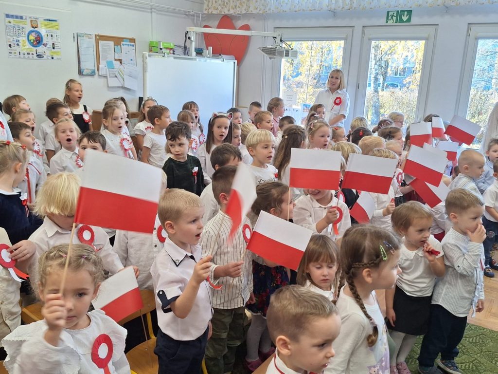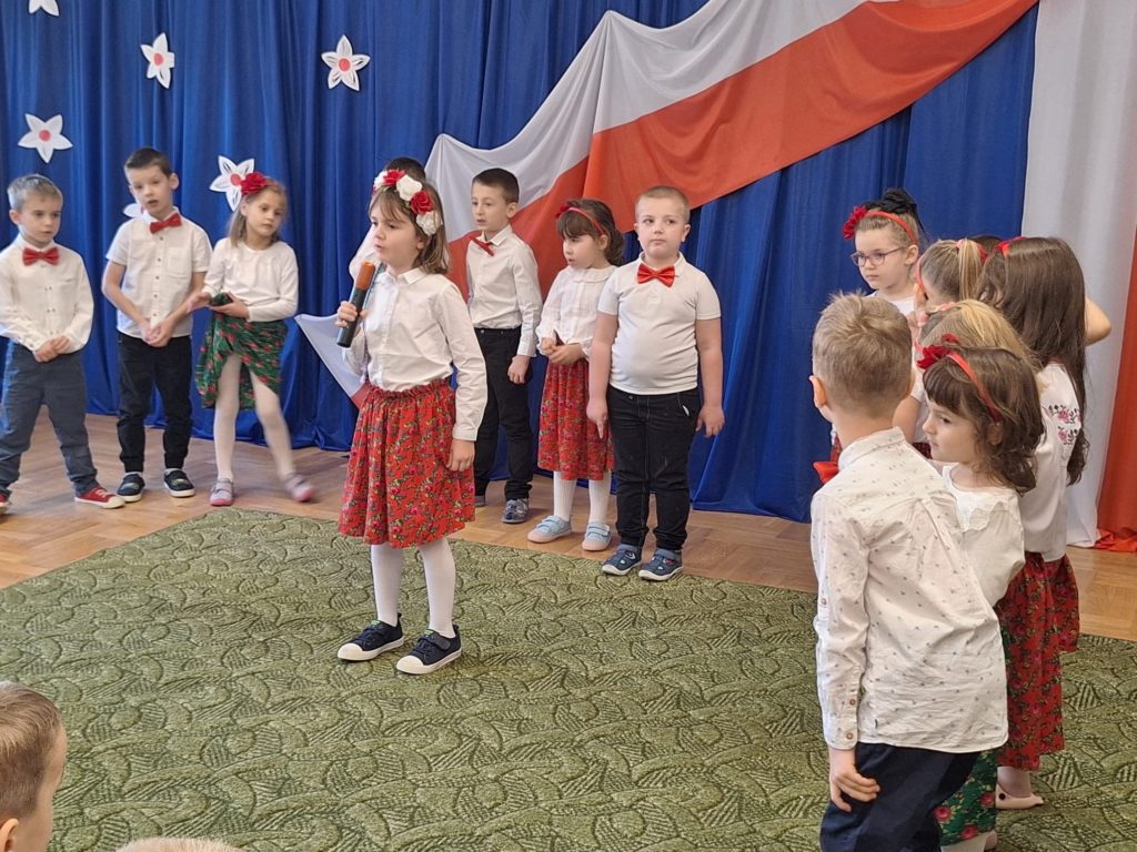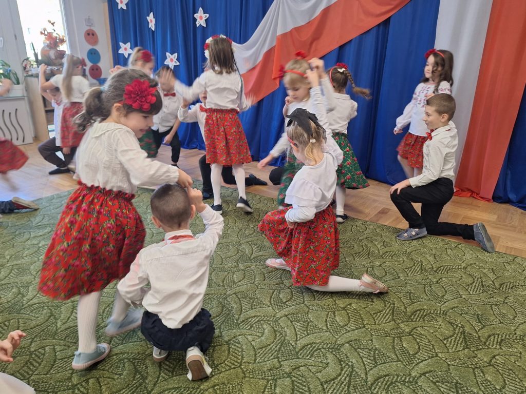 W piątek w naszym przedszkolu odbyła się wyjątkowa uroczystość z okazji Narodowego Święta Niepodległości, którą przygotowały dzieci z grupy „Motylki”. Przedszkolaki z dużym zaangażowaniem i dumą zaprezentowały program artystyczny pełen tańca, muzyki i patriotycznych wzruszeń. Dzieci wystąpiły w tradycyjnych polskich tańcach narodowych, takich jak polonez, kujawiak, oberek oraz krakowiak, prezentując piękno polskiej kultury i tradycji. Dziewczynki przedstawiły również poruszający taniec z kwiatami w biało-czerwonych barwach w nowoczesnej aranżacji. Podczas uroczystości nie zabrakło również pieśni i piosenek patriotycznych, które wprowadziły wszystkich w podniosły nastrój. Jednym z najbardziej wzruszających momentów było wspólne odśpiewanie piosenki „To Polska właśnie, to moje miejsce” przez całą społeczność przedszkolną. Nasze przedszkole włączyło się także w ogólnopolską akcję „Szkoła do hymnu”, w ramach której wszyscy zebrani odśpiewali cztery zwrotki Mazurka Dąbrowskiego. Był to piękny i poruszający moment wspólnoty oraz wyraz szacunku dla historii naszej Ojczyzny. Dziękujemy dzieciom z grupy „Motylki” za wspaniały występ, a nauczycielom oraz rodzicom za przygotowanie i wsparcie. To była uroczystość, którą z pewnością zapamiętamy na długo.