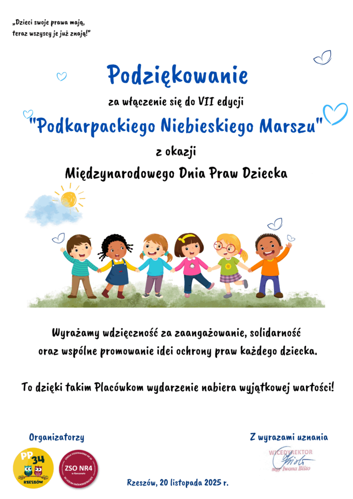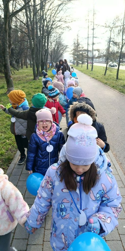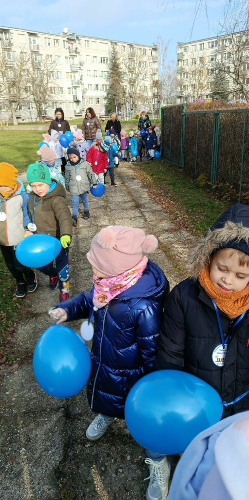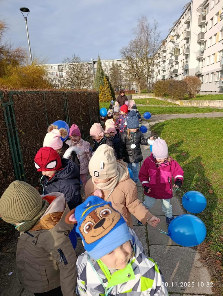 Ważnym punktem dnia był udział w Podkarpackim Niebieskim Marszu, w którym wzięły udział wszystkie grupy. Ubrane w niebieskie elementy stroju z niebieskimi medalami i trzymając w rękach baloniki, dzieci przemaszerowały po osiedlu, głośno i radośnie przypominając, że prawa dziecka są ważne każdego dnia. Marsz był nie tylko pięknym wspólnym przeżyciem, ale także okazją do integracji i budowania poczucia wspólnoty.