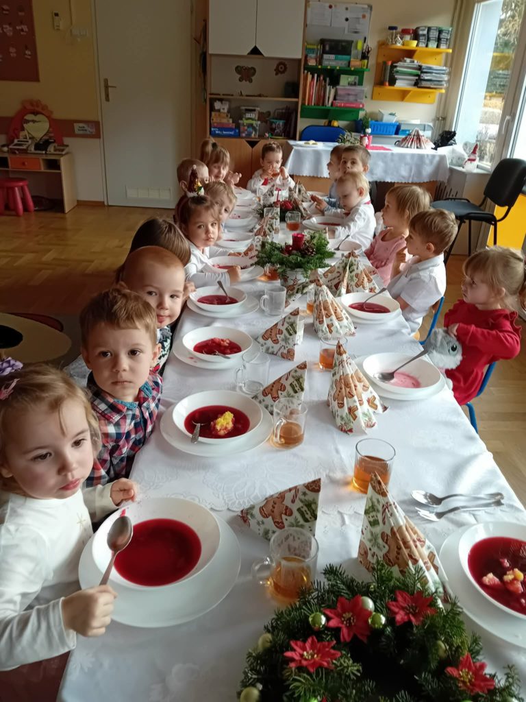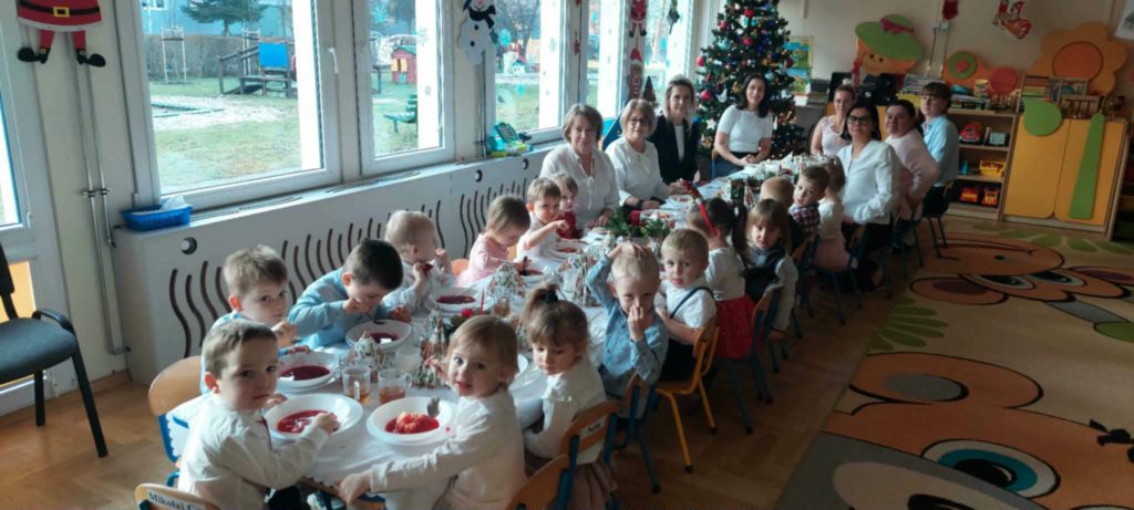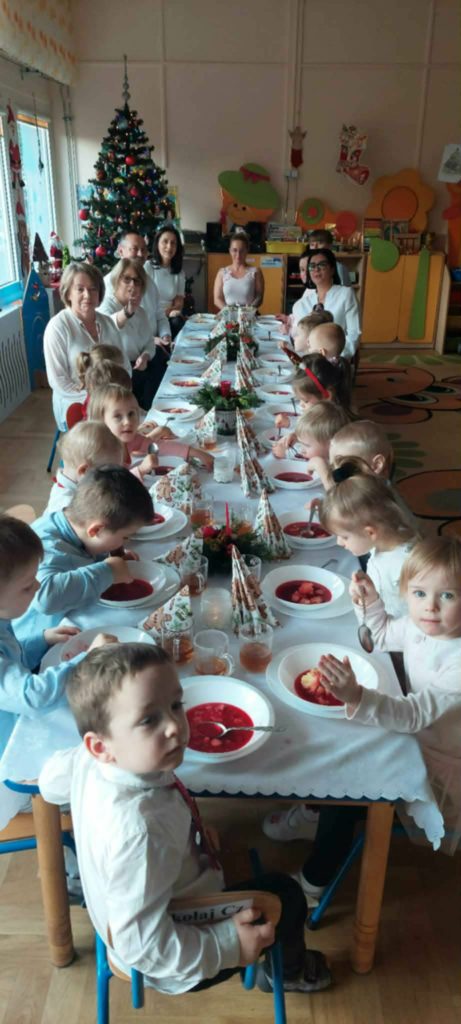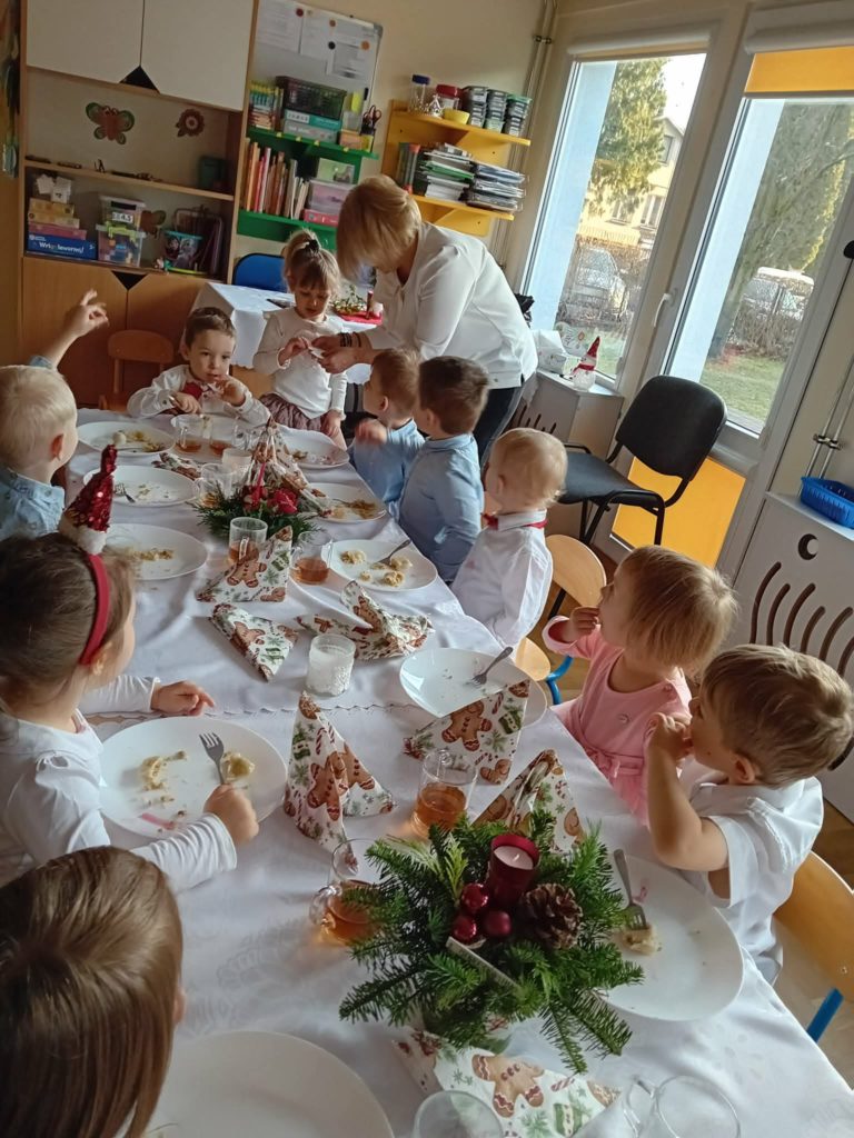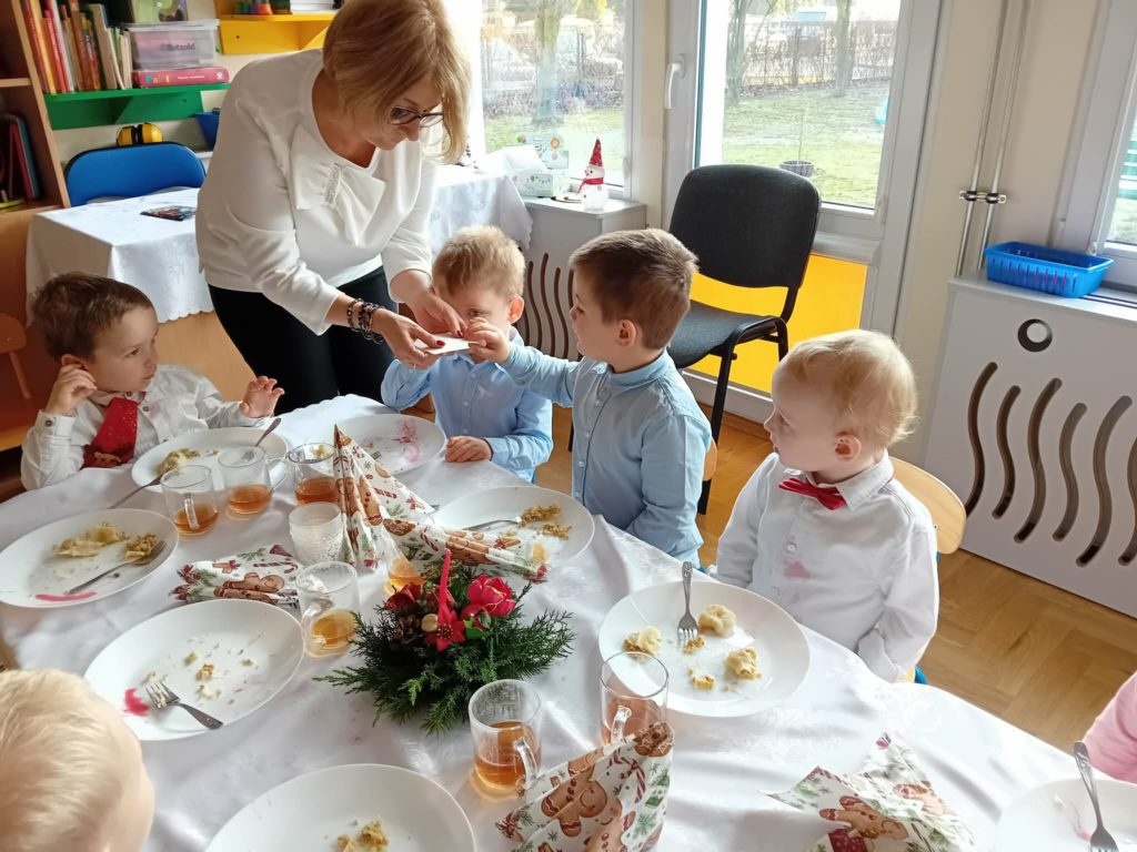 19 grudnia obchodziliśmy w naszym przedszkolu jeden z najpiękniejszych dni w roku – Wigilię Bożego Narodzenia. W sali przedszkolnej odświętnie ubrane przedszkolaki wysłuchały życzeń, które złożyły im panie wychowawczynie oraz Pani Dyrektor. Następnie wszyscy zasiedli do pięknie, przystrojonych stołów, na których czekał świąteczny obiad. Nie zabrakło również wspólnego śpiewania kolęd i pastorałek oraz poznawania bożonarodzeniowych tradycji. Ten dzień wypełniony był radością, ciepłem oraz dziecięcą ciekawością i wzruszeniem. Czas upłynął w bardzo miłej i serdecznej atmosferze.