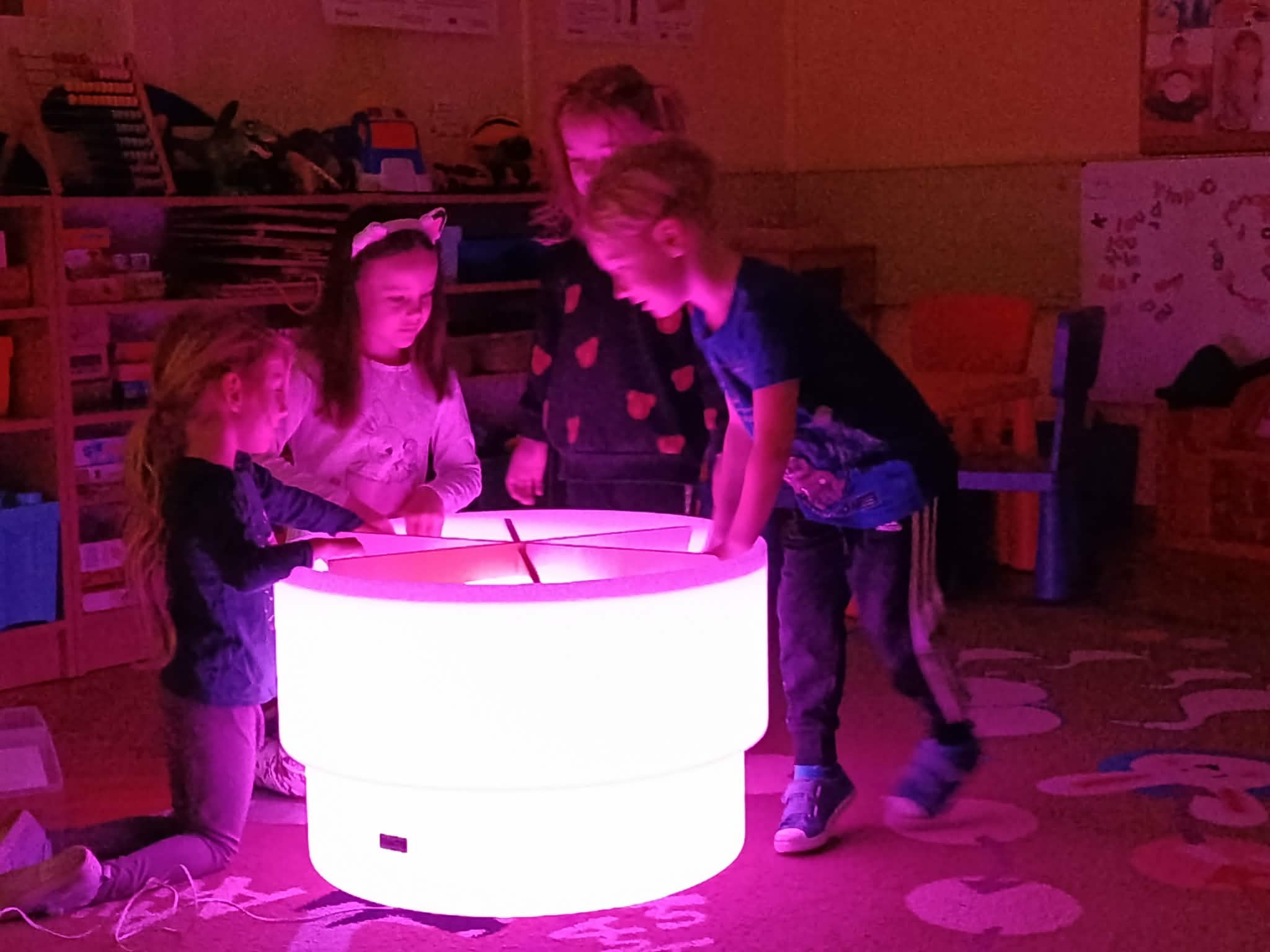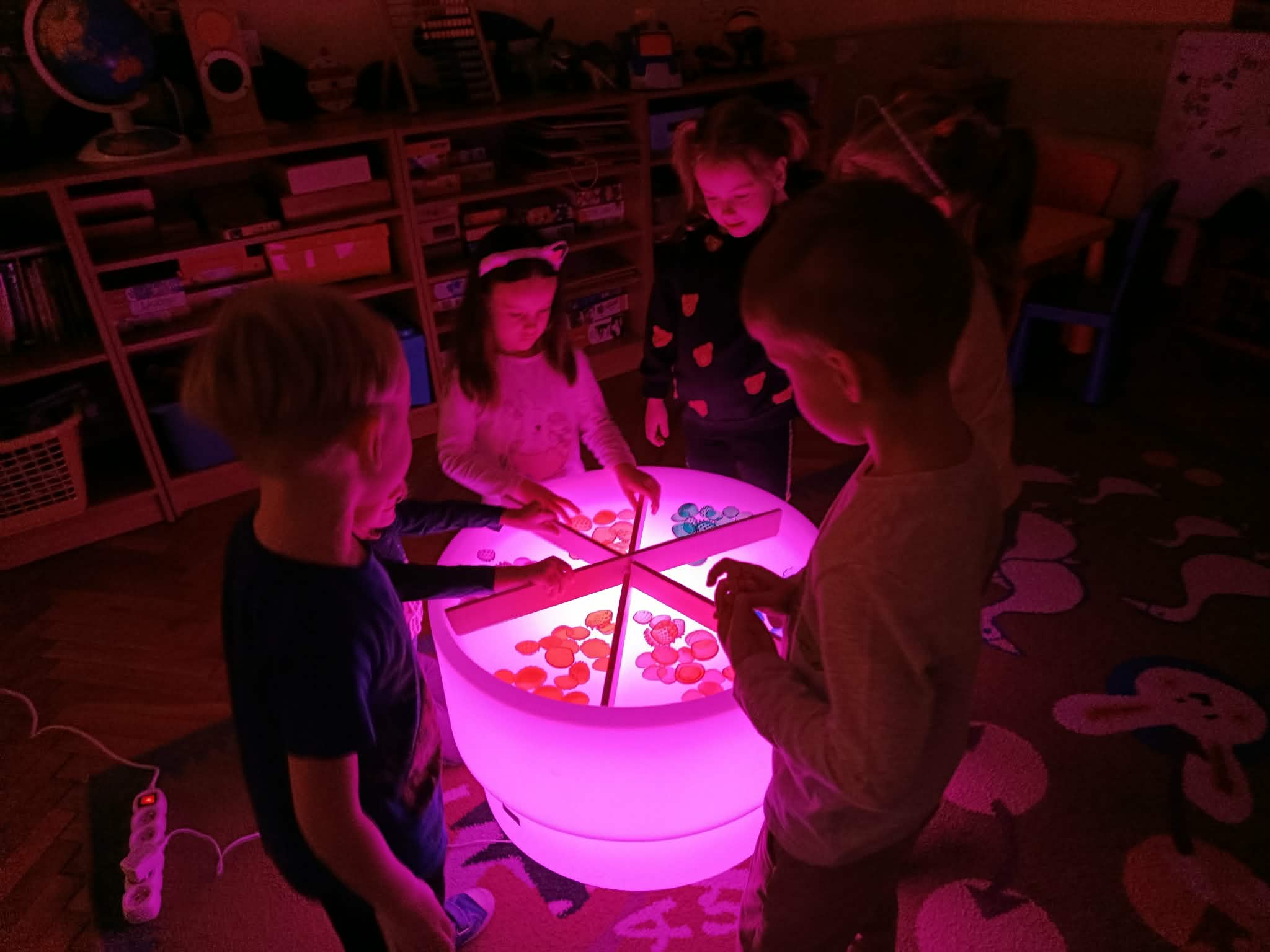 Dzieci bawią się m.in. przezroczystymi klockami, kolorowymi foliami. Zabawy te rozwijają motorykę małą, koordynację ręka–oko, koncentrację oraz kreatywność. Stolik podświetlany sprzyja także wyciszeniu, współpracy w grupie i nauce poprzez doświadczanie.