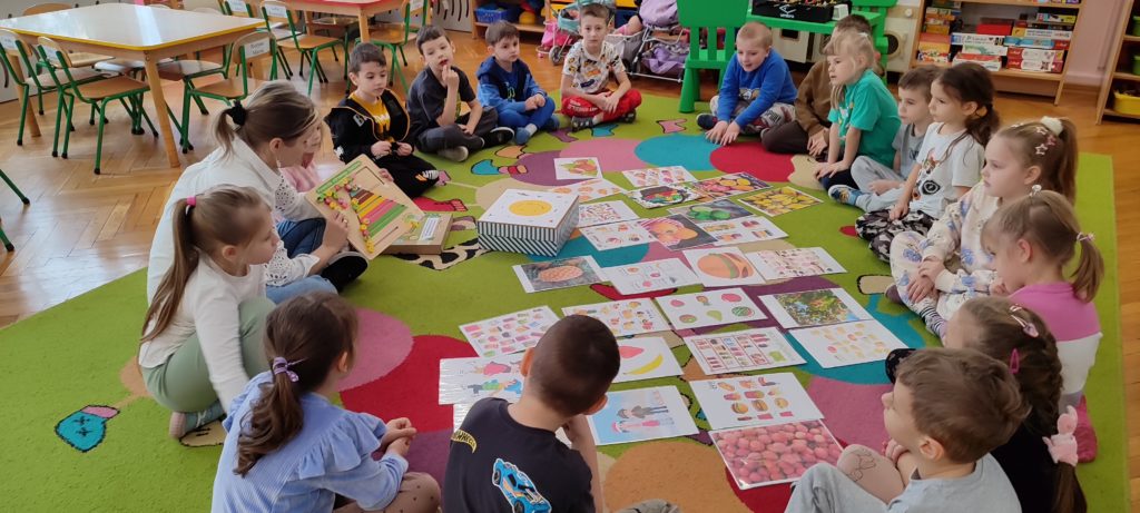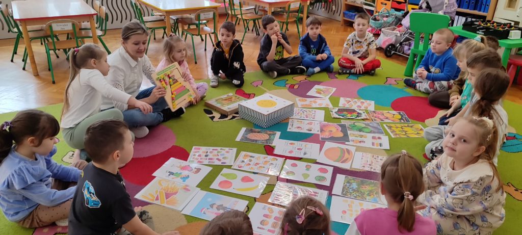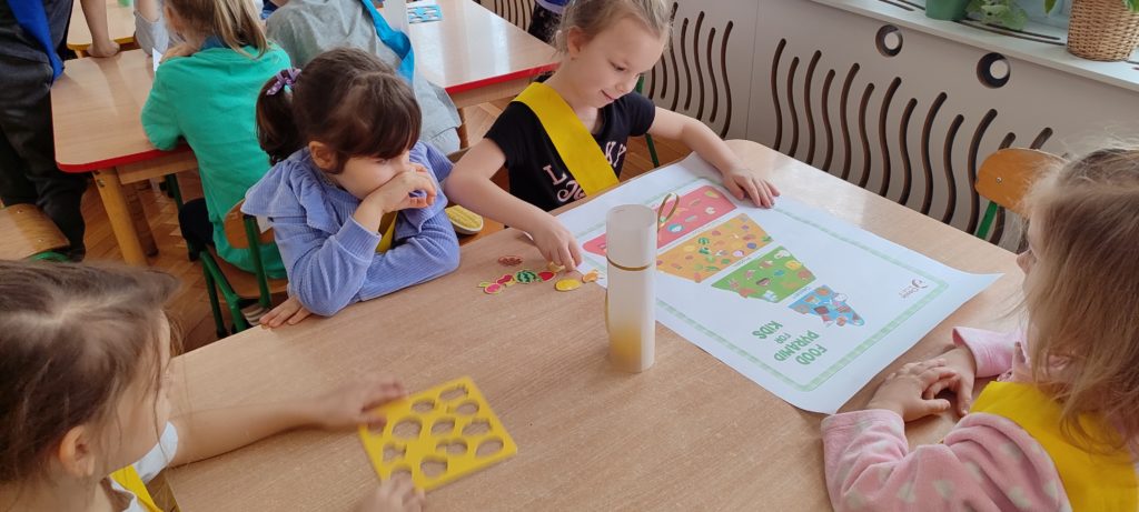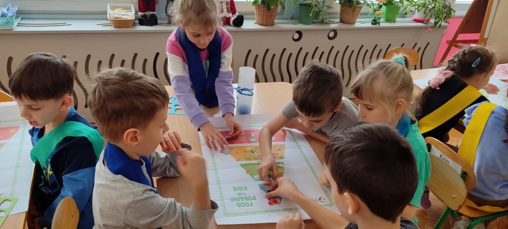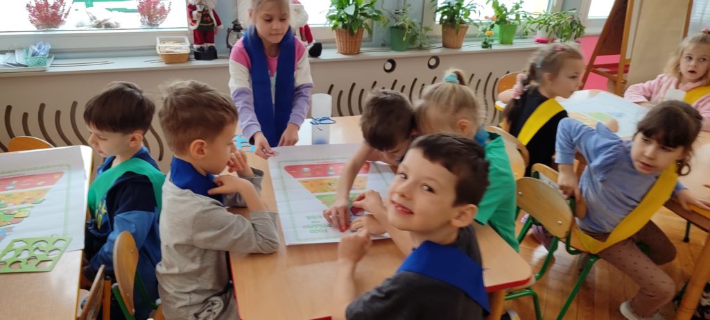 Podczas zajęć poruszony został również temat zdrowego stylu życia i prawidłowego odżywiania. Dzieci zapoznały się z Piramidą Zdrowego Żywienia, dowiedziały się, że jej podstawą jest codzienna aktywność fizyczna oraz picie wody. Wyjaśnione zostało pojęcie aktywności fizycznej. Przedszkolaki umiały wymienić różne aktywności np: spacer, jazda na rowerze, pływanie, gra w piłkę, sporty zimowe, jazda na nartach, łyżwach, sankach. Omówione zostały kolejne piętra piramidy, takie jak: