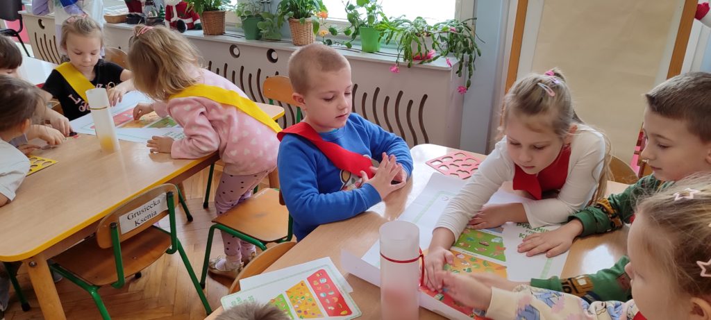 Dzieci aktywnie uczestniczyły w rozmowie, chętnie dzieliły się swoimi doświadczeniami oraz wskazywały zdrowe produkty. Poznały czym można zastąpić słodycze np: słodkimi owocami, orzechami czy bakaliami. Umiały odróżnić zdrową żywność od przetworzonej. Dzieci pracowały w grupach przy stoliku, układały puzzle zgodnie ze szczeblami piramidy. Zajęcia przyczyniły się do poszerzenia wiedzy na temat zdrowego odżywiania i znaczenia ruchu dla zdrowia oraz samopoczucia.