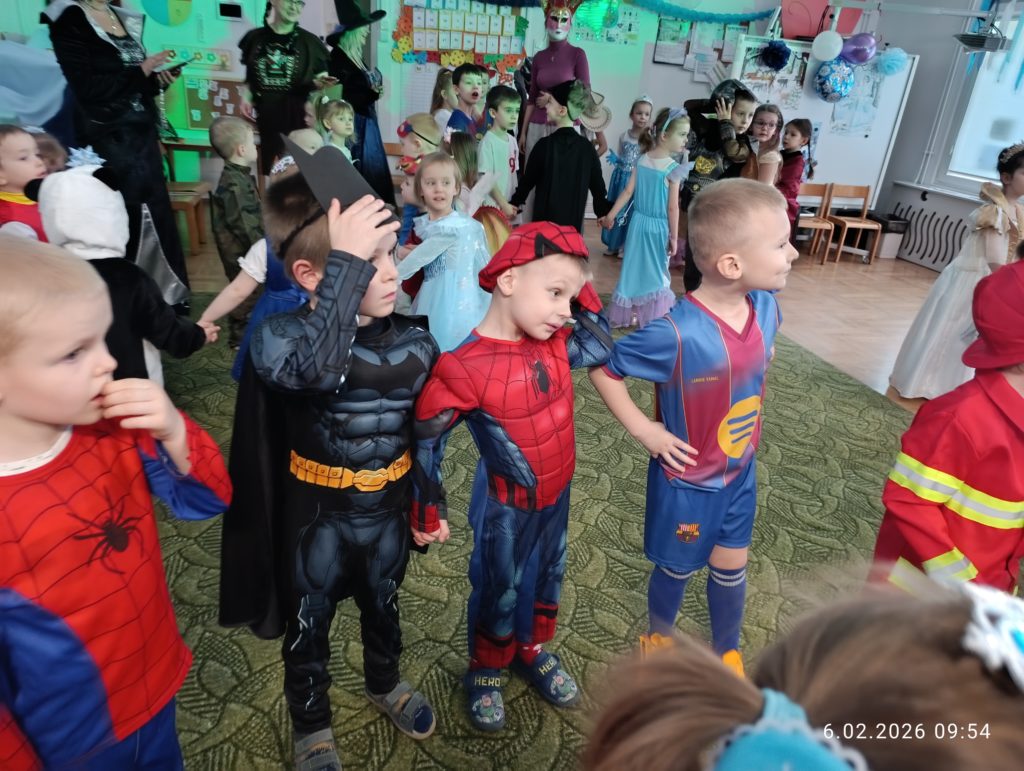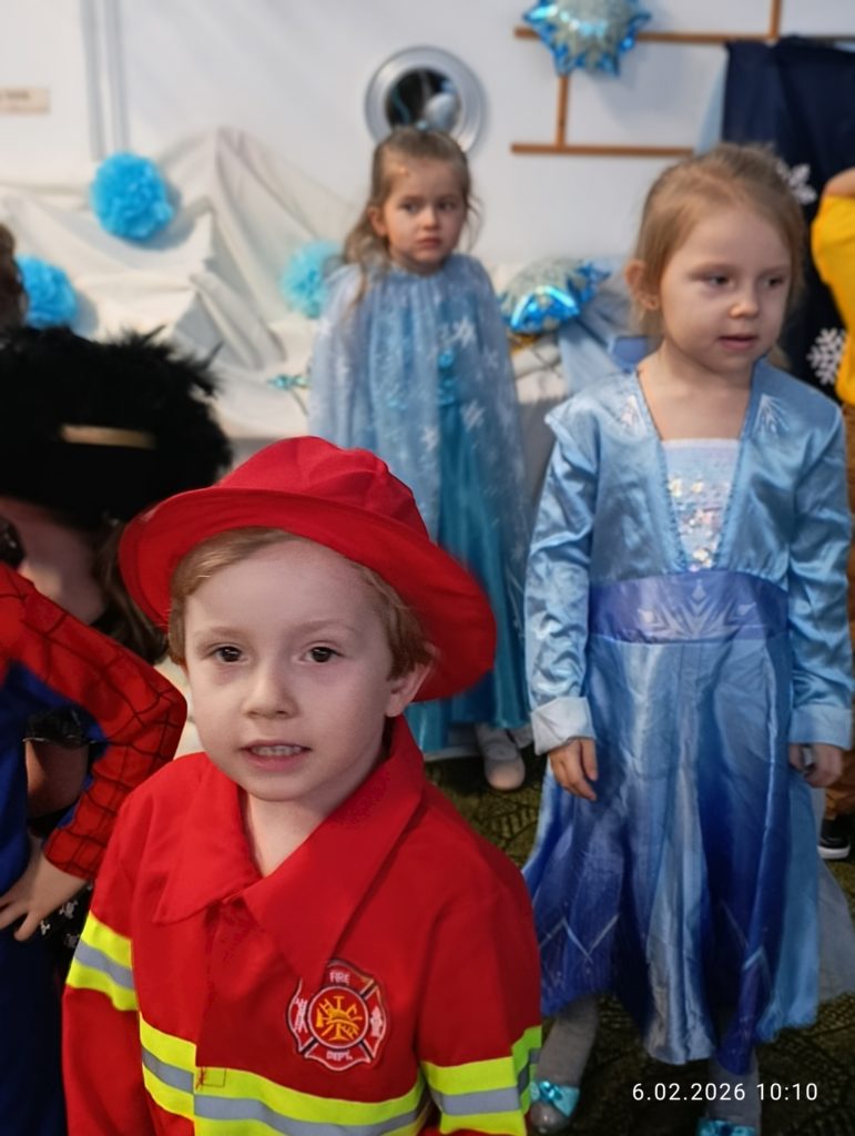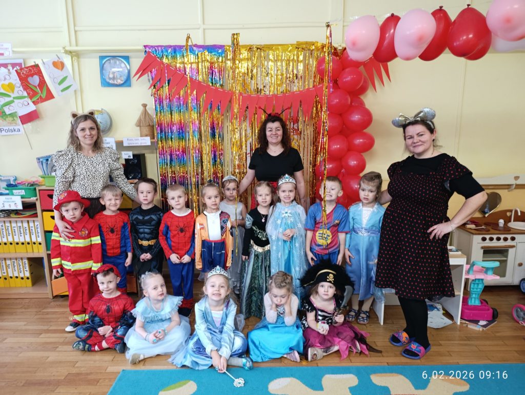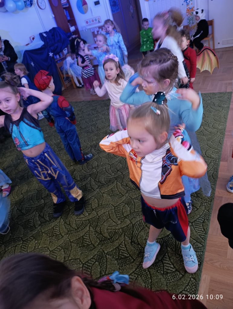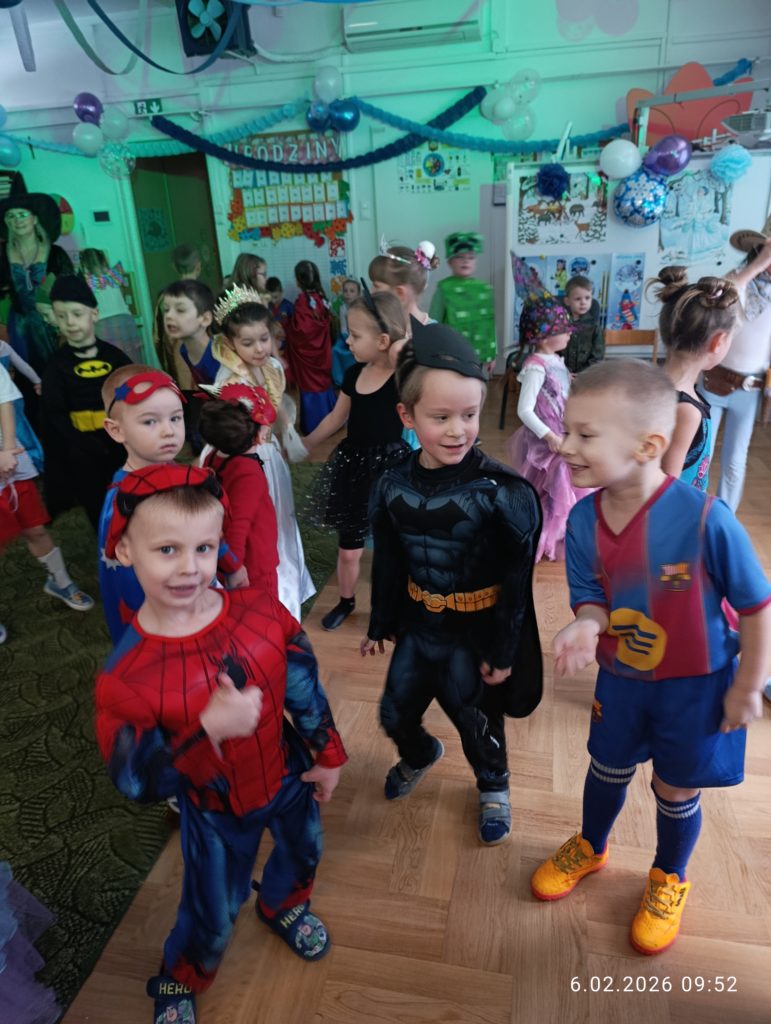 Dnia 06.02.2026 r. całe przedszkole wzięło udział w balu karnawałowym, również dzieci z naszej grupy „Misie”. Dzieci wcieliły się w różne postacie bajkowe. Zamieniły się w m.in. w królewny, księżniczki, spidermanów, piratów, strażaków. Przedszkolacy świetnie bawili się, uczestnicząc we wspólnych zabawach oraz konkursach, a skoczna i rytmiczna muzyka zachęcała do tańca. Wszystkim zabawom towarzyszył śmiech, radość i spontaniczna aktywność dzieci. Cały bal karnawałowy przebiegał w miłej, serdecznej atmosferze i dostarczył niezapomnianych wrażeń.