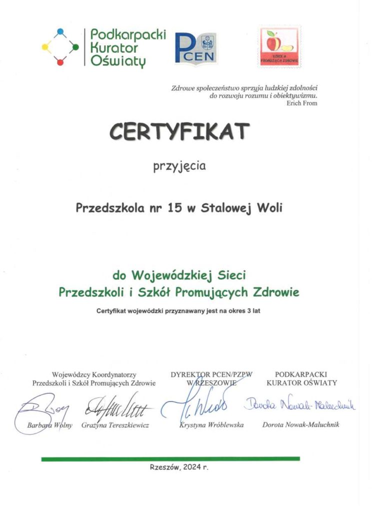 Nasze przedszkole otrzymało Wojewódzki Certyfikat Przedszkoli Promujących Zdrowie.